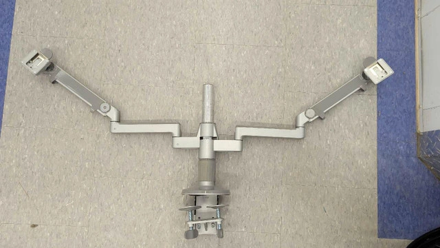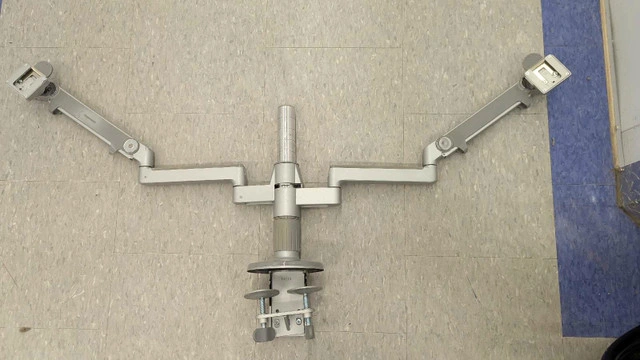 This monitor arm is an adjustable mount that holds two screens, improving ergonomics and saving desk space. It features height, tilt, swivel, and rotation adjustments, VESA compatibility, clamp or grommet mounting, and cable management. Ideal for professionals and gamers, it supports monitors typically weighing 13-22 lbs each.