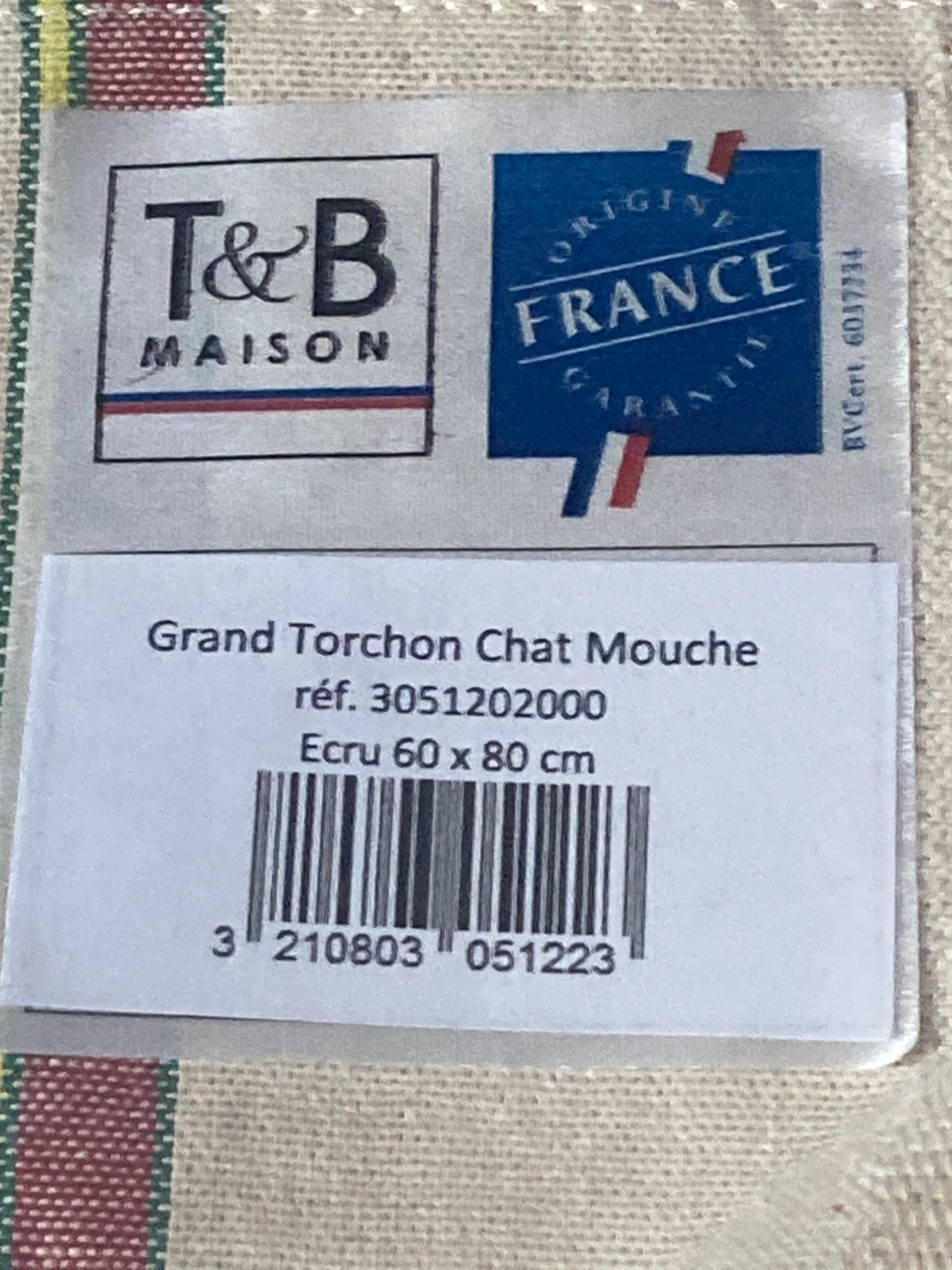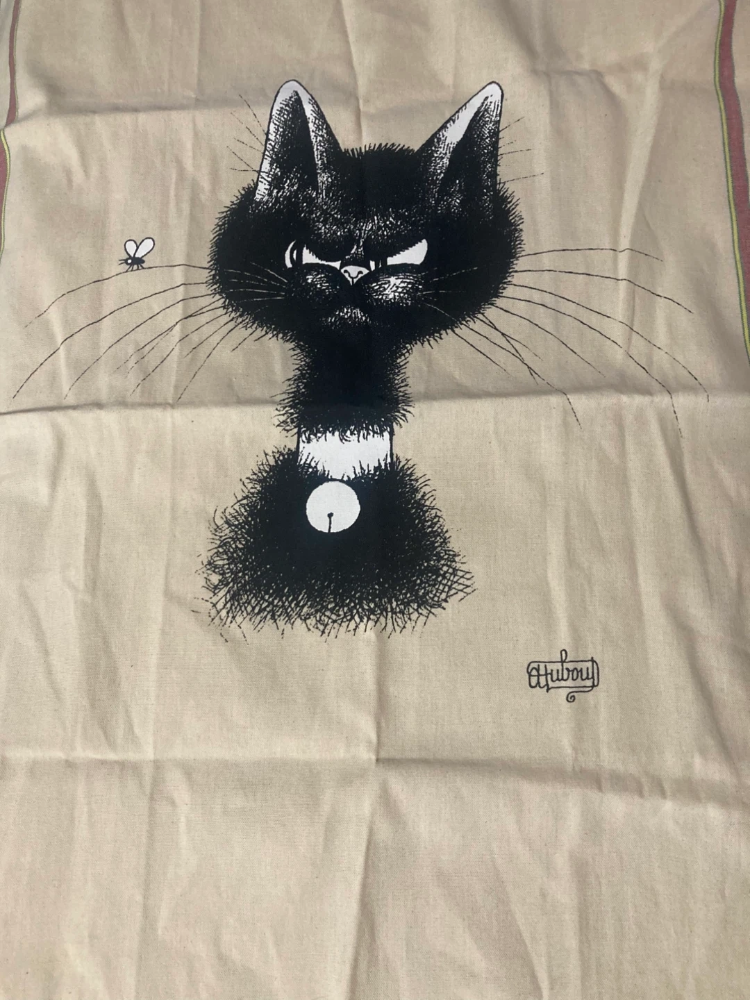 This is a Dubout Grand Torchon Chat Mouche kitchen towel. It's ecru in colour and measures 60 x 80 cm. Made in France from 100% cotton, it features a charming black cat and fly design. New never been used hence the fold marks lol