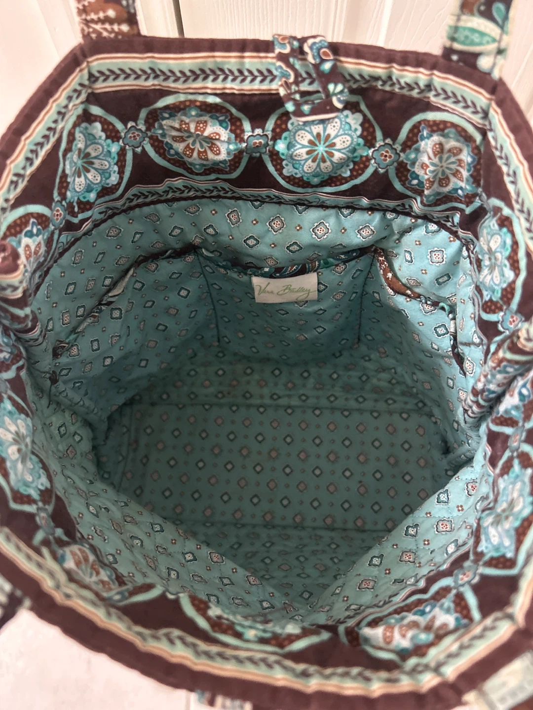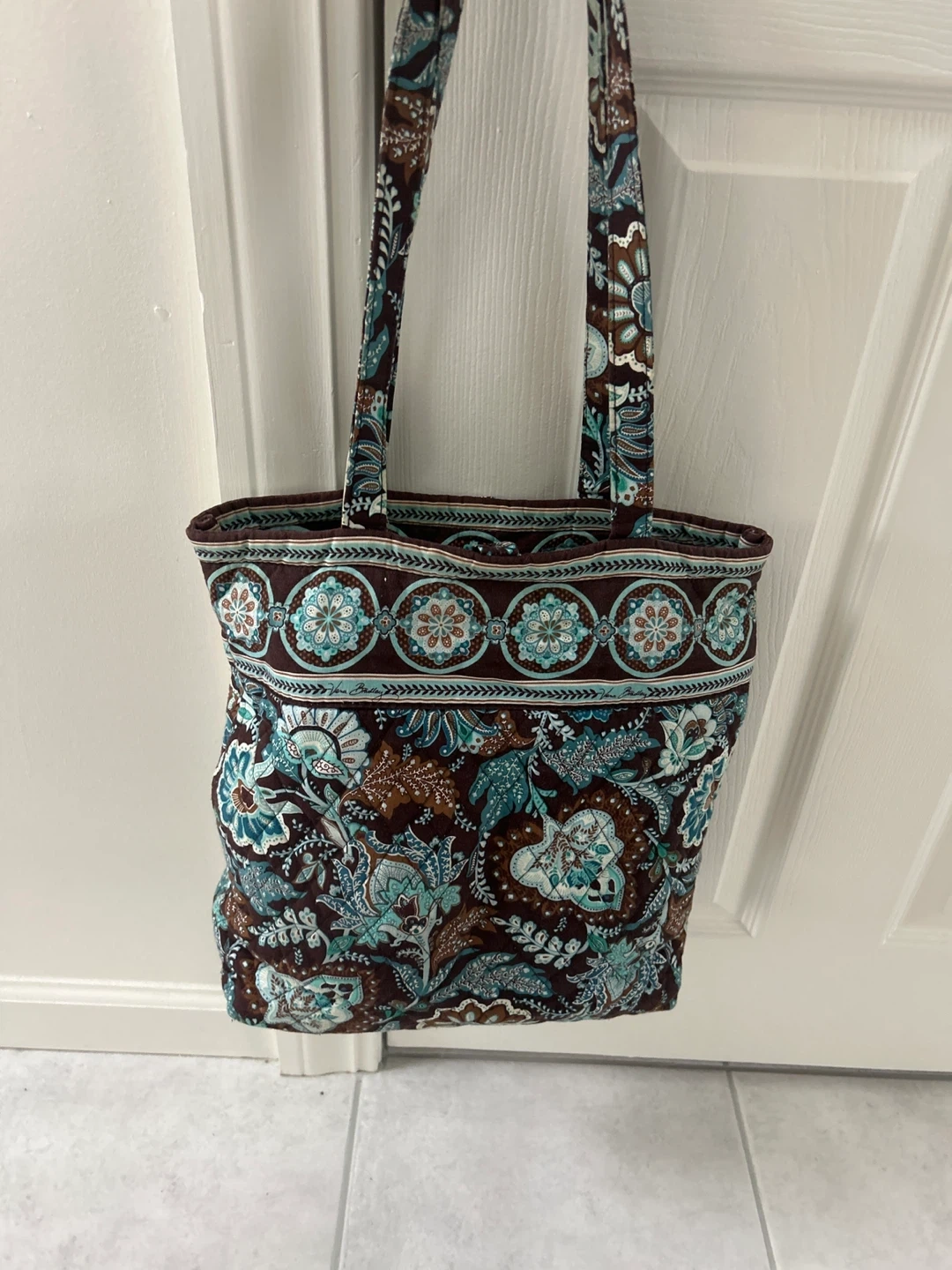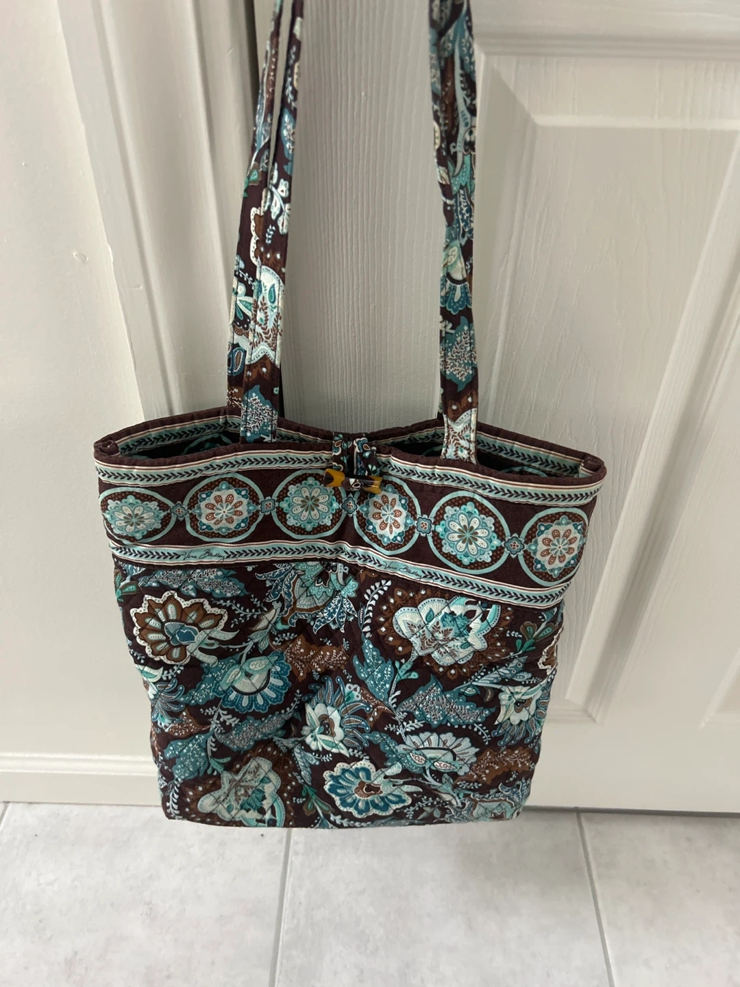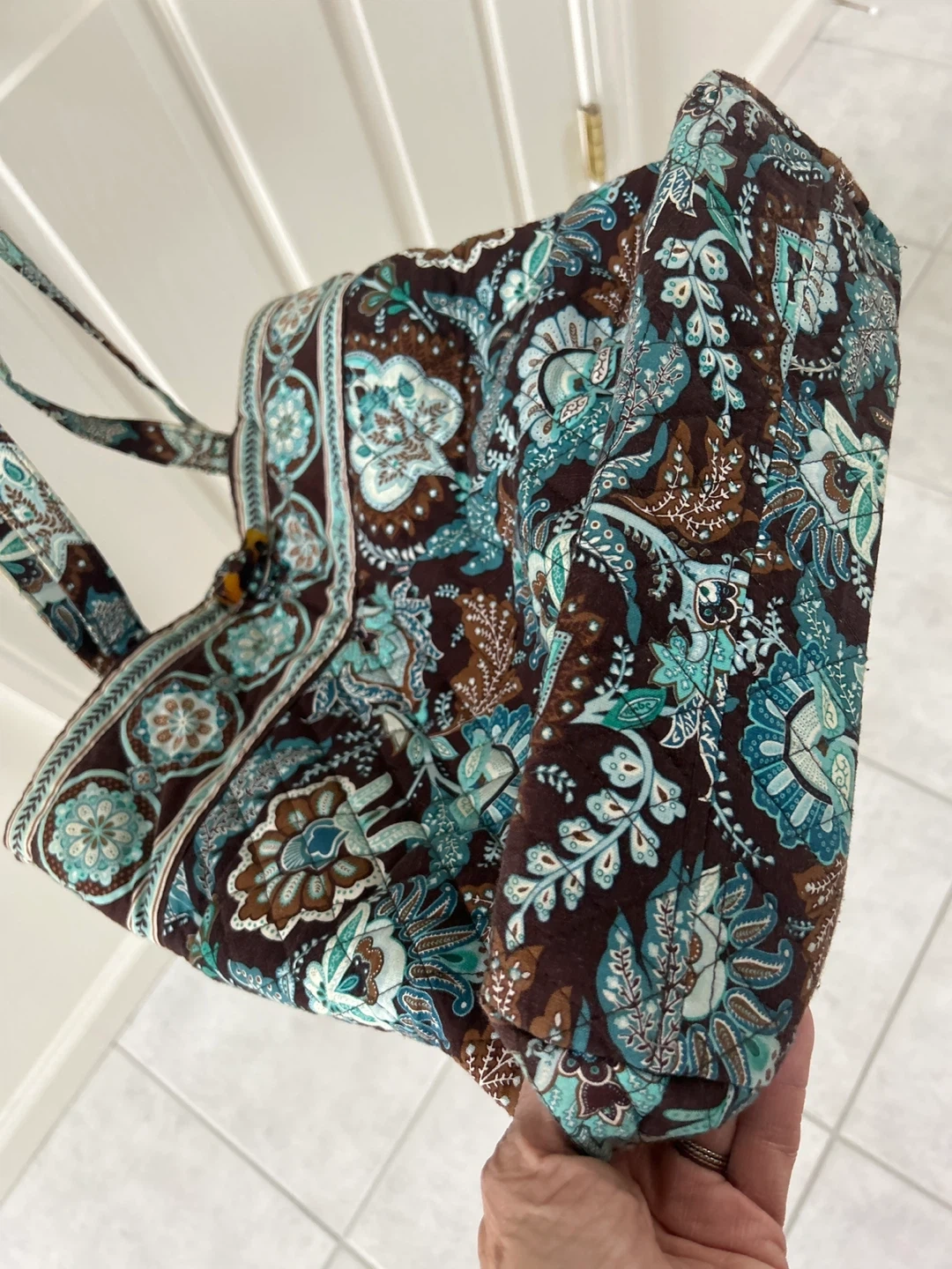 This quilted tote bag features a colorful floral and paisley pattern. It has a fabric lining and interior pockets. It's a stylish and practical bag for everyday use!