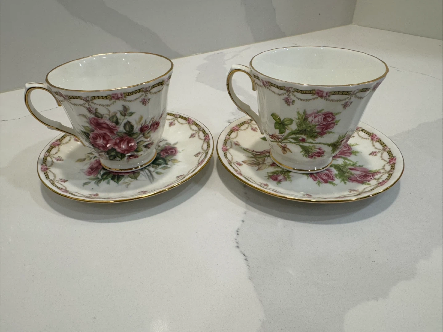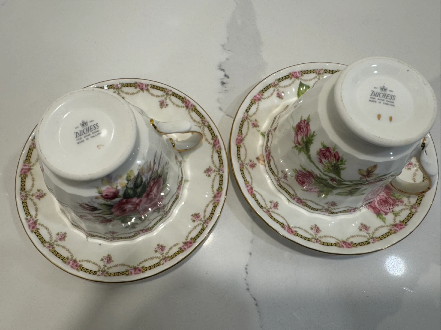 Selling a lovely set of Duchess fine bone china tea cups and saucers! The set features a delicate floral pattern with pink roses and gold trim.