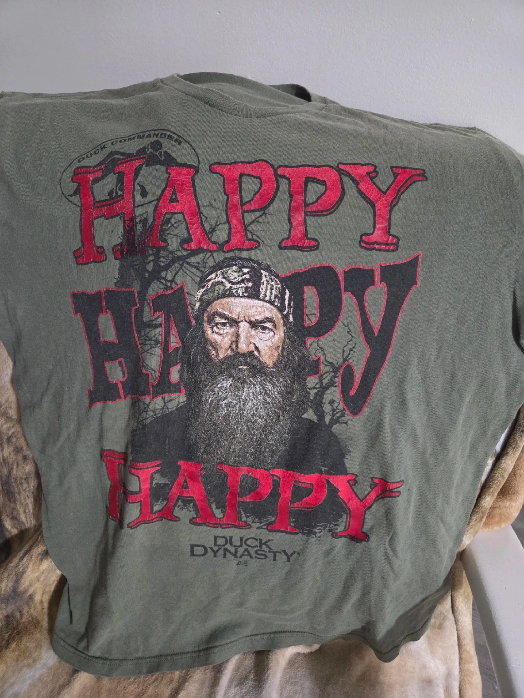 68Duck Dynasty T-shirt with a graphic print featuring the Robertson family. The shirt is a dark green colour with red lettering.