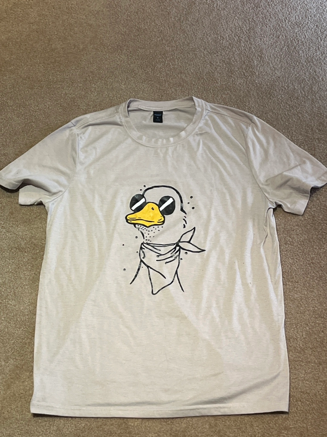 Here's a fun t-shirt with a duck graphic! The shirt is a light beige colour. It's in great condition and ready for a new home