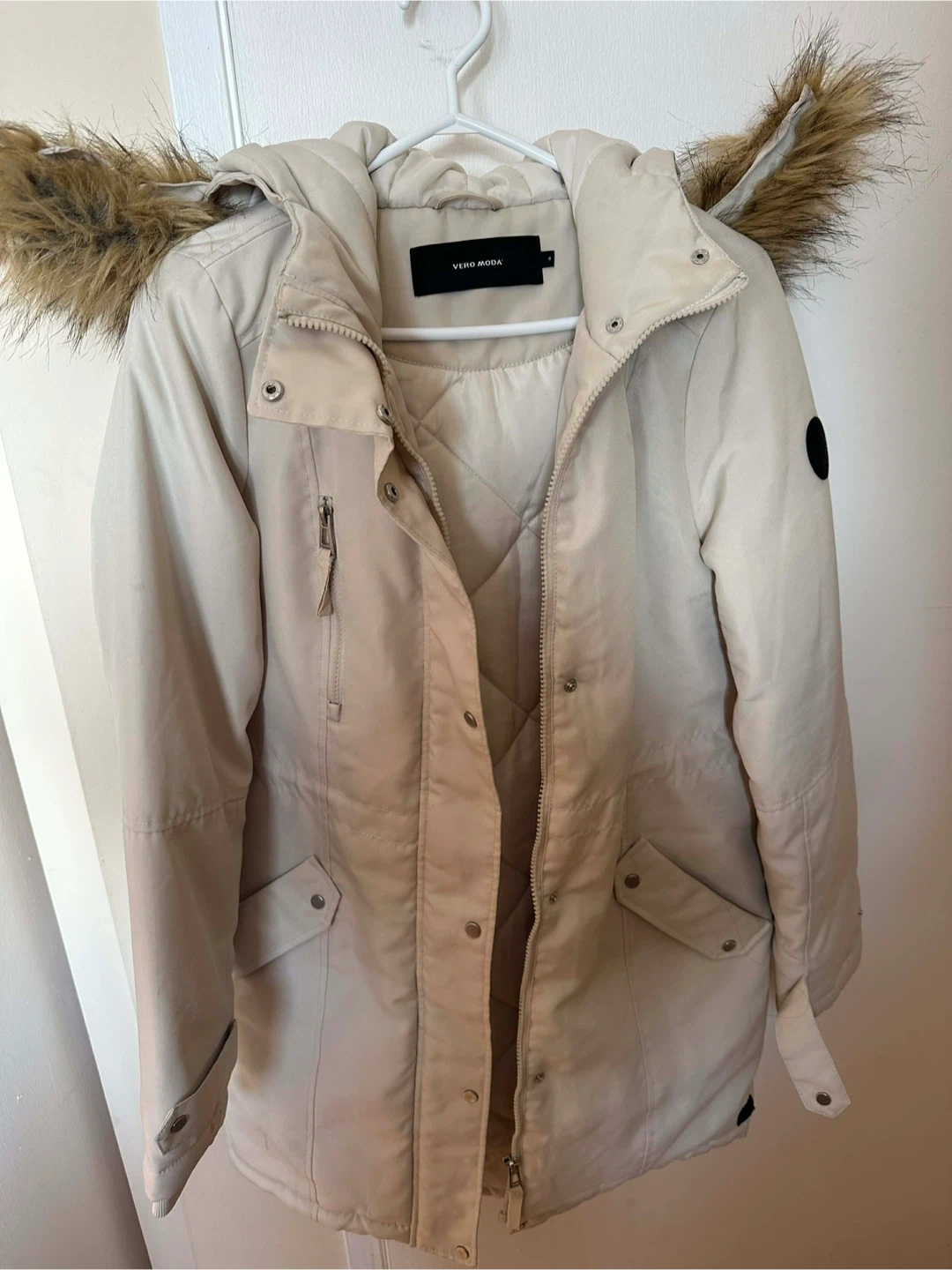 This VERO MODA winter parka is a size small and comes in a nice beige colour. It features a warm, quilted lining and a faux fur-trimmed hood, perfect for staying cosy during colder months. The jacket has multiple pockets and a zippered closure with snap buttons. Pick up cash only
