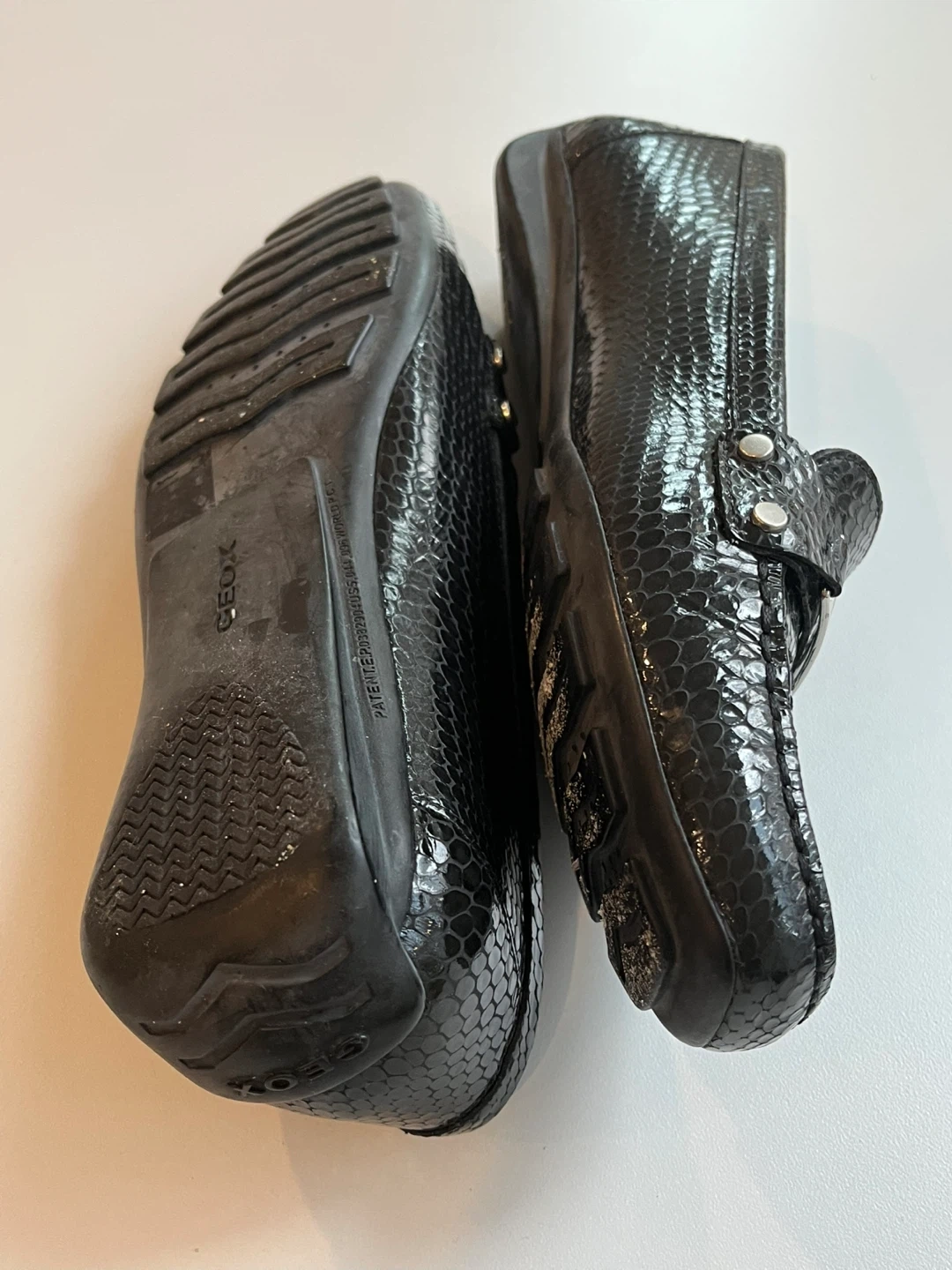 Comfortable GEOX loafers with a stylish black snakeskin . These shoes are designed for breathability and a great fit. Features a decorative silver buckle at the front.