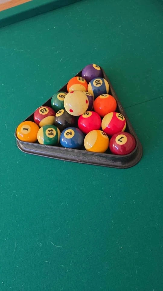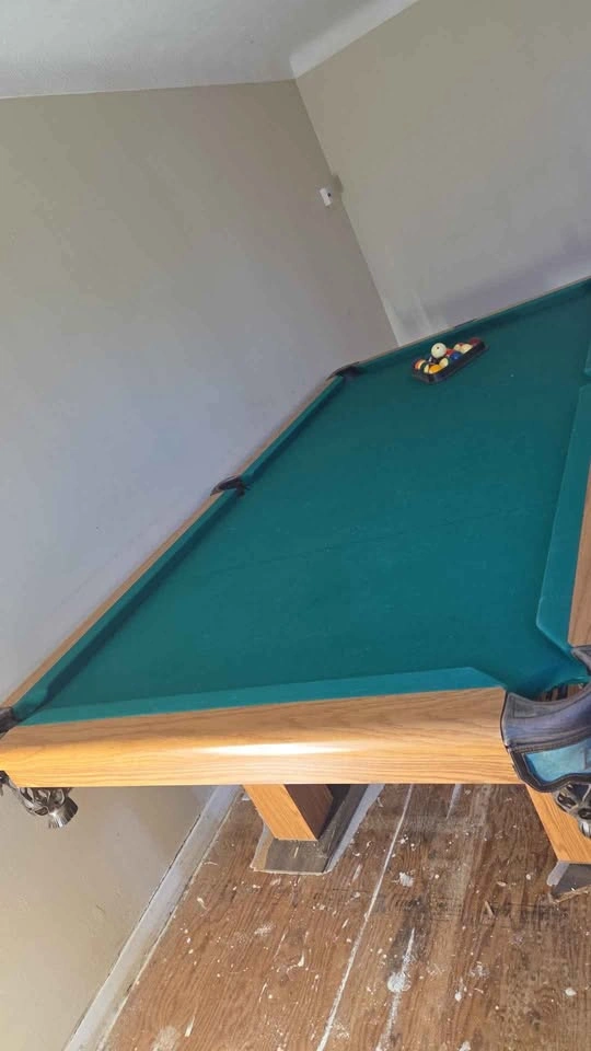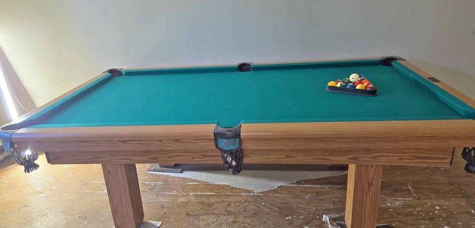 The felt on this table still looks great! This price includes the rack, cover, cues and all the balls. It measures approximately 98 long by 53 wide 32 1/2 tall. Must disassemble and remove yourself, please bring help to lift.