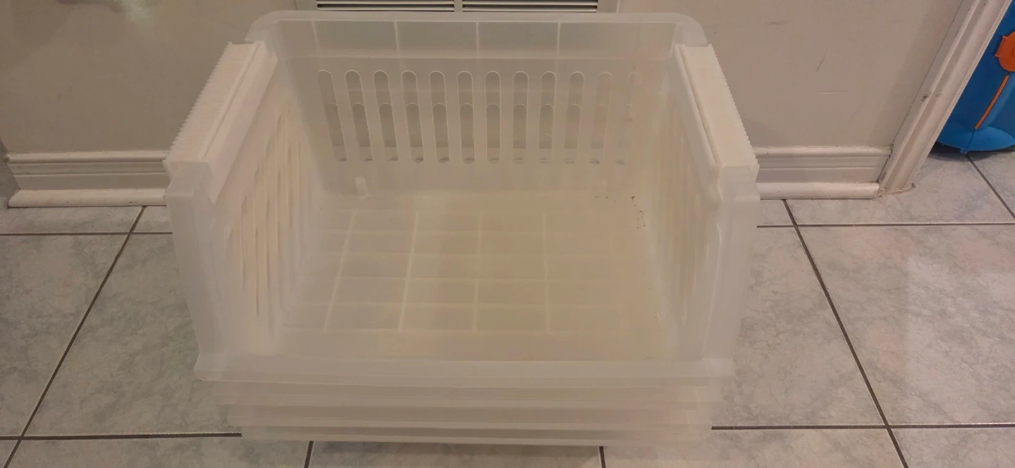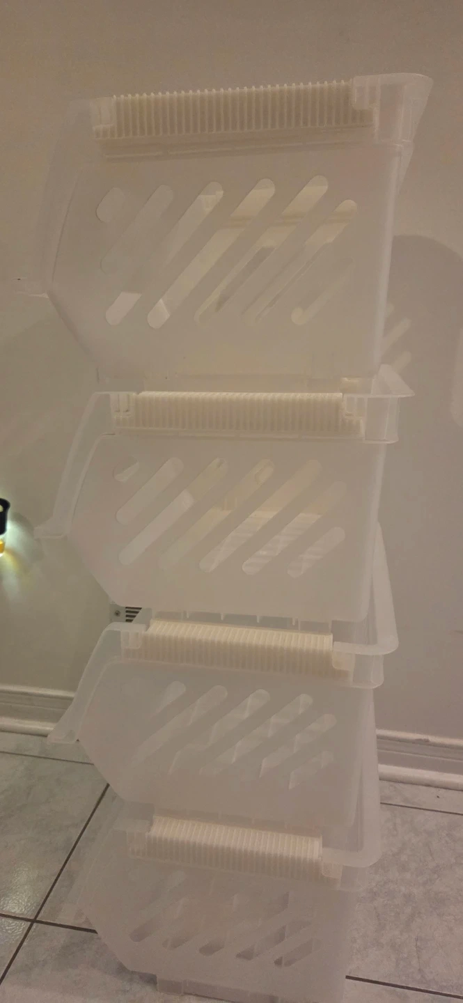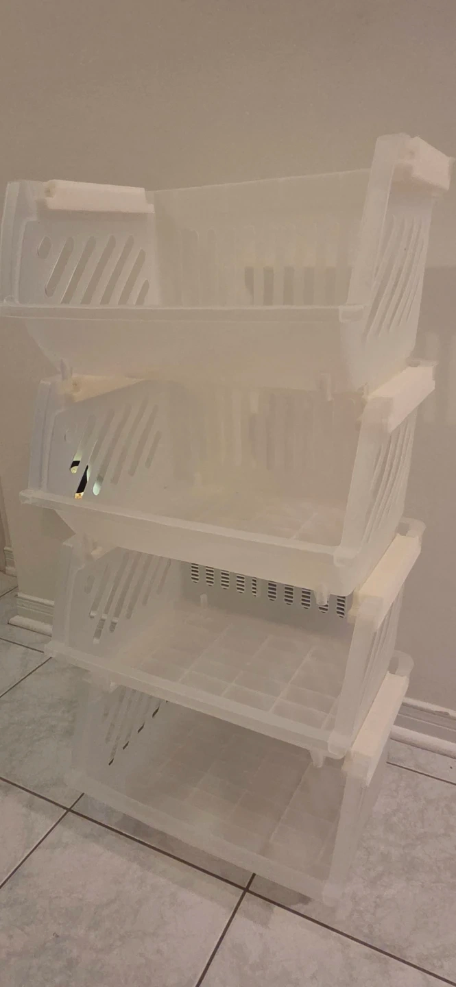 Set of four stackable plastic storage bins. These bins are clear and opaque white. They're designed for easy organization and can be stacked to save space. Each bin has ventilation slots and handles for carrying.