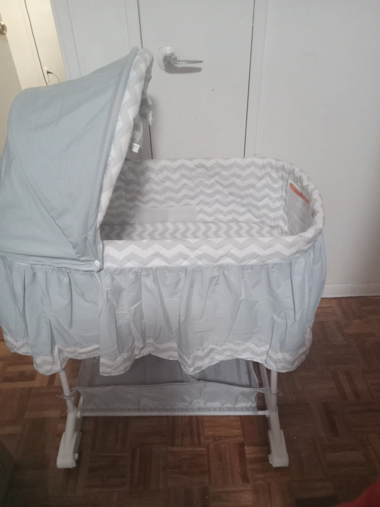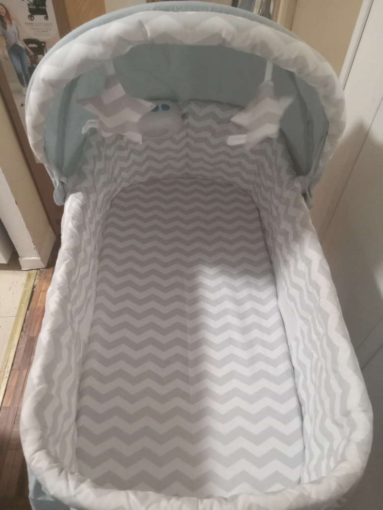 Grey and white chevron pattern. Includes canopy, storage basket, and vibration feature. Gently used.0-9mth.