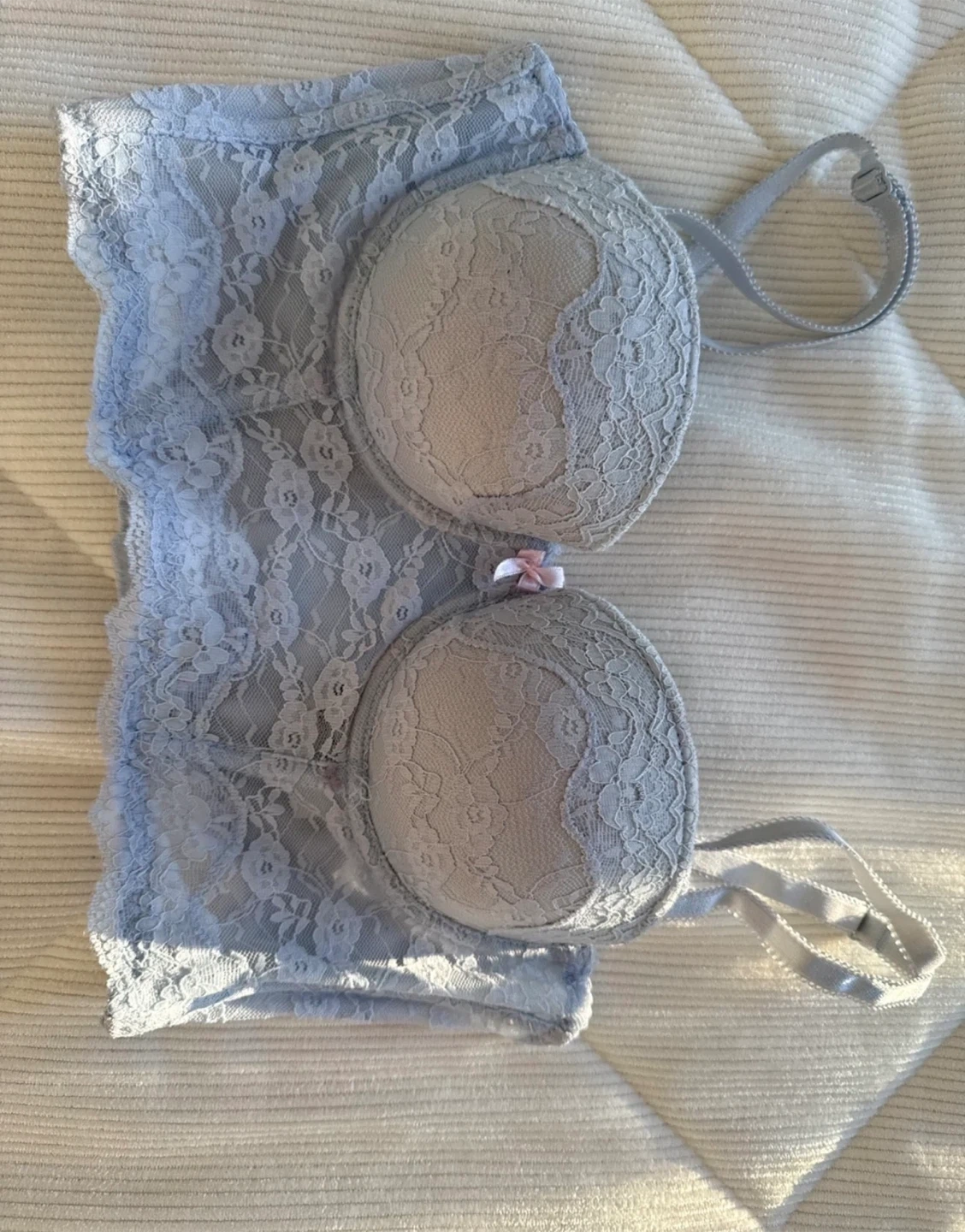 This lot includes a PINK Victoria's Secret sports bra with a triangle print, a white bra, and a blue lace bralette. The PINK bra features "PINK" lettering on the straps. The lace bralette has a corset-style design. You can take them all for 50$