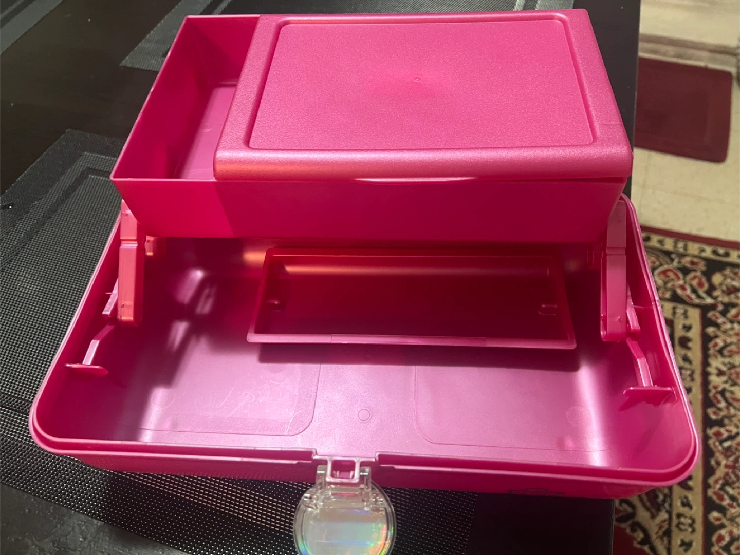 This is a pink sparkle train case perfect for makeup or art supplies. It has a built-in mirror and multiple compartments for organization. Durable plastic construction.