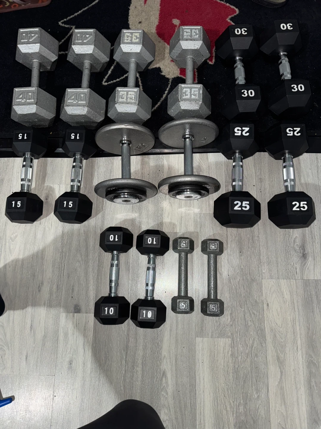 104Set of dumbbells 5lbs to 40lbs Looks brand new 2x5lbs 2x10lbs 2x15lbs 2x20lbs 2x25lbs 2x30lbs 2x35lbs 2x40lbs Pick up at whitehorn ne