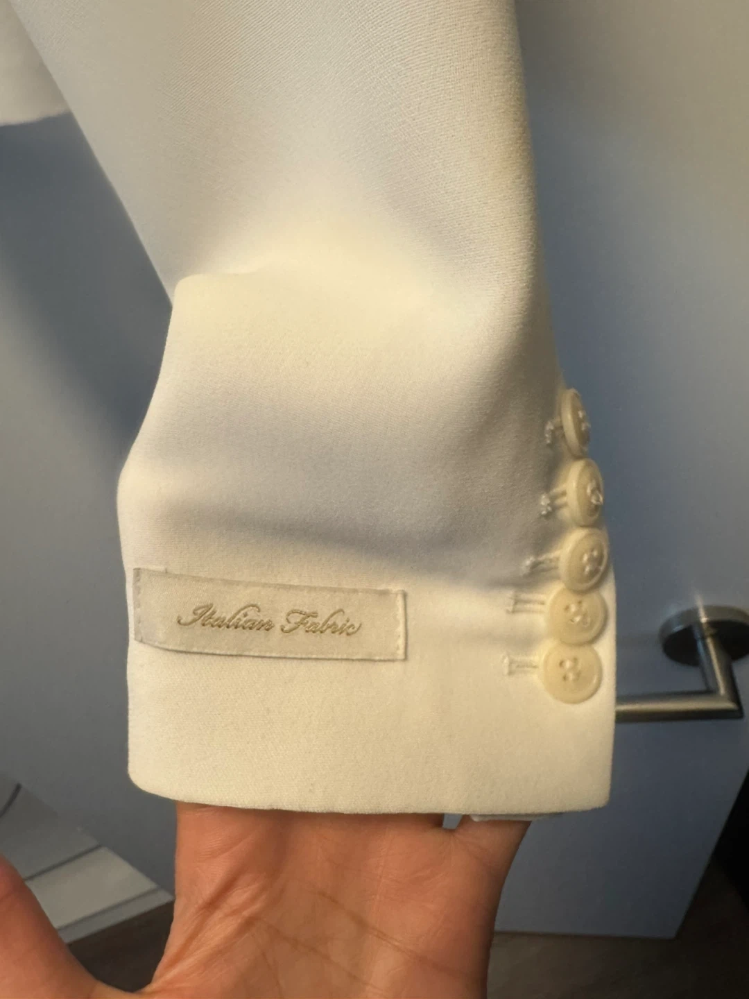 Stylish white cropped blazer from Ted Baker. Made with Italian fabric. Features a double-breasted button closure and decorative buttons on the cuffs. Size 1. Equal to a XS/S originally purchased for $400