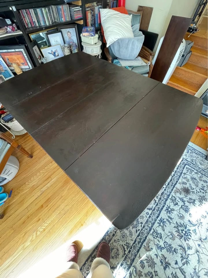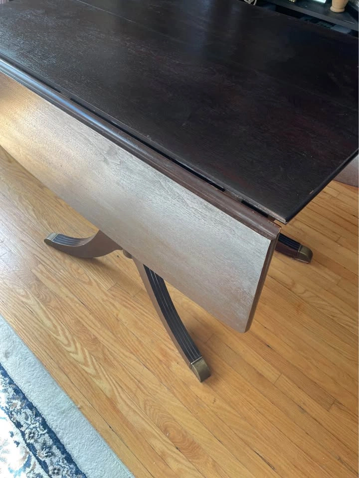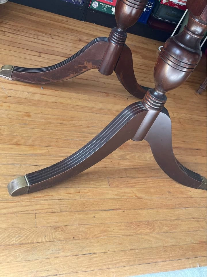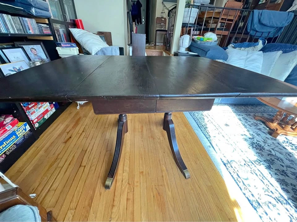 Vintage Duncan Phyfe style drop leaf dining table with two extra leaves. Perfect for small spaces - seats 2 to 8 people. * Solid wood construction in a dark stain * Double pedestal design with brass toe-caps * Internal mechanism ensures easy operation * Drop leaves on the ends add more length * Middle section extends with two extra leaves Dimensions: Smallest with leaves down: 24.5”L x 38”W With drop Leaves: 54”L x 38”W Fully extended with 2 extra leaves: 72”L x 38”W Note: the table is very sturdy, and in excellent condition for its age but it is NOT perfectly level.