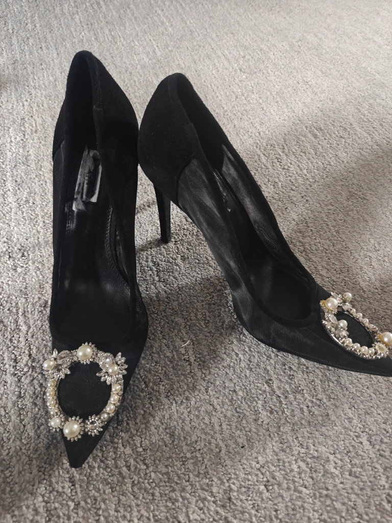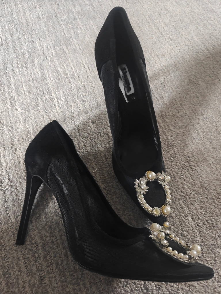 18These dune heels are in great condition and ready for a new home! They are a size 40 and feature a unique pearl and rhinestone embellishment. The black colour makes them versatile for any occasion 2 beads missing hardly noticeable...never worn