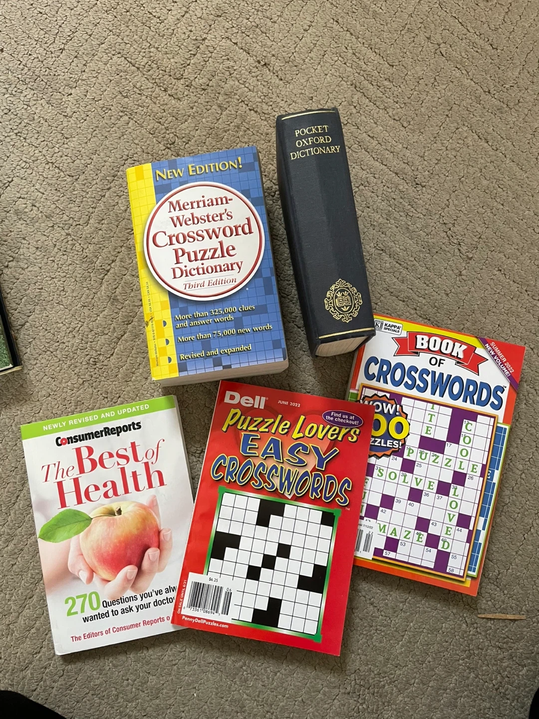 This lot includes a Merriam-Webster's Crossword Puzzle Dictionary, a Pocket Oxford Dictionary, a Book of Crosswords, and Consumer Reports' The Best of Health. The crossword dictionaries offer extensive clue and word selections.