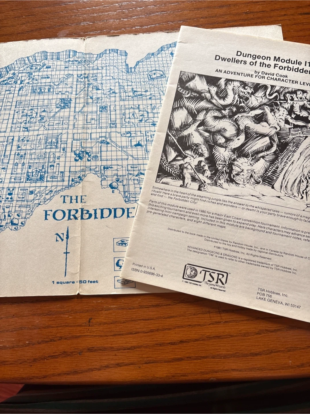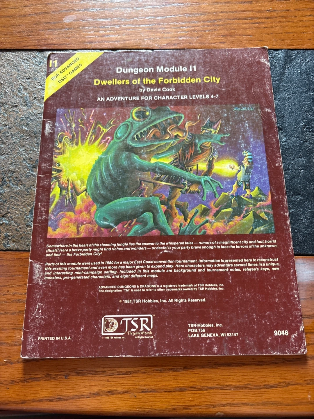 Selling the Advanced Dungeons & Dragons module I1, Dwellers of the Forbidden City by David Cook! This adventure is for character levels 4-7. It was printed in 1981 by TSR Hobbies, Inc. Includes maps!