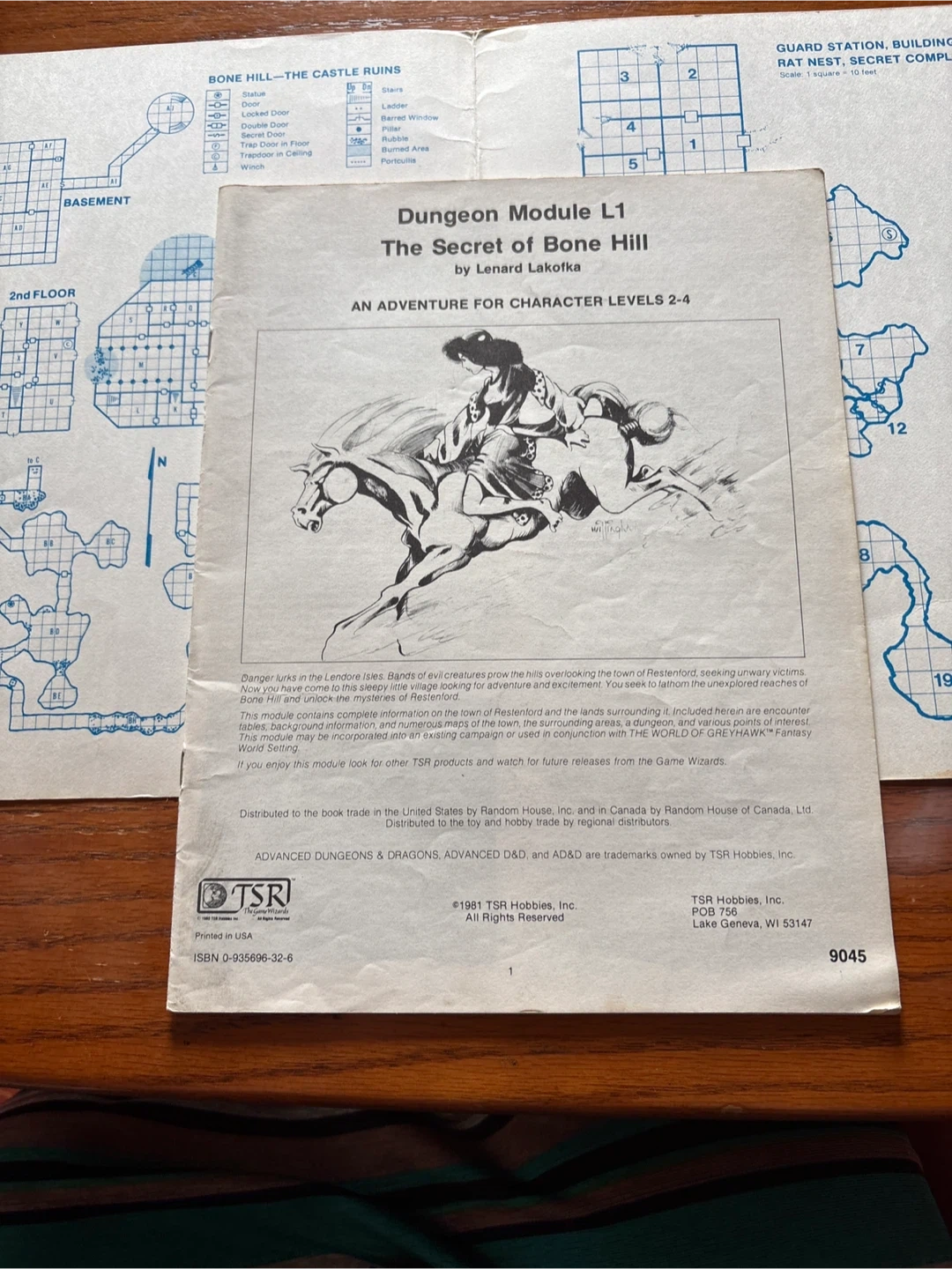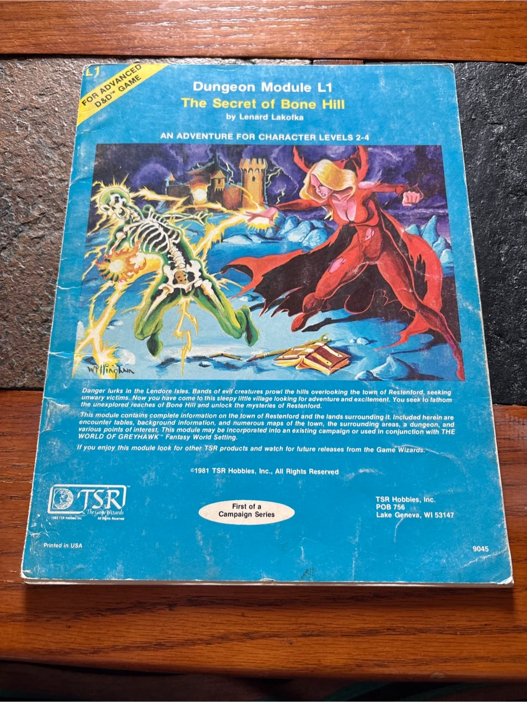 Selling Dungeon Module L1: The Secret of Bone Hill by Lenard Lakofka! This is an adventure for character levels 2-4 for Advanced Dungeons & Dragons (AD&D). It's in good condition and ready for a new adventure!