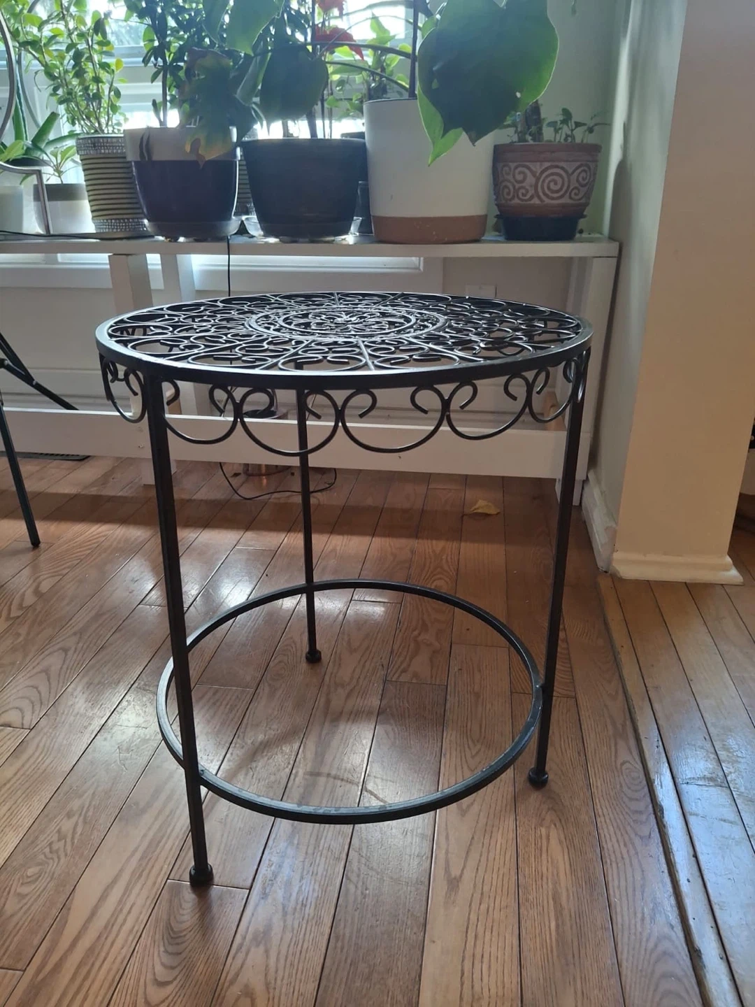 Selling a metal accent table in great condition! It features a decorative, patterned top and a sturdy metal frame. Perfect as a side table or plant stand