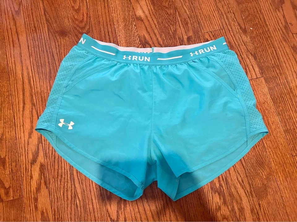 Comfy Under Armour shorts in a bright teal color. Features perforated side panels and an elastic waistband with 'RUN' text. Great for workouts or casual wear. Pickup in Sherwood Park or Devon.
