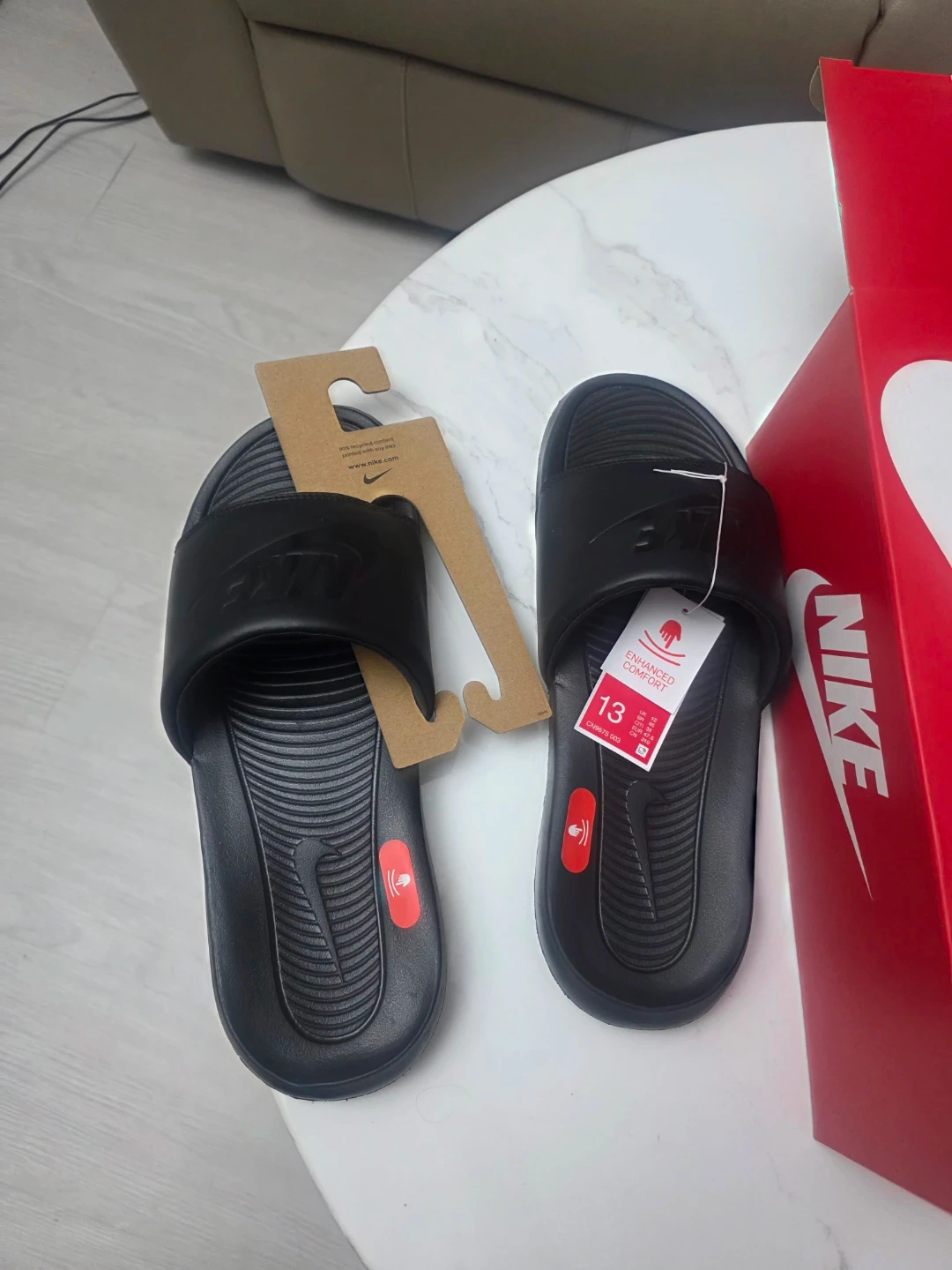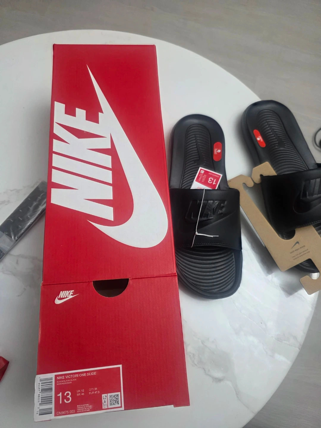 Brand new Nike Victor One slides in black. These are a size 13. They're designed for enhanced comfort and feature a slip-on design. Includes the original box.
