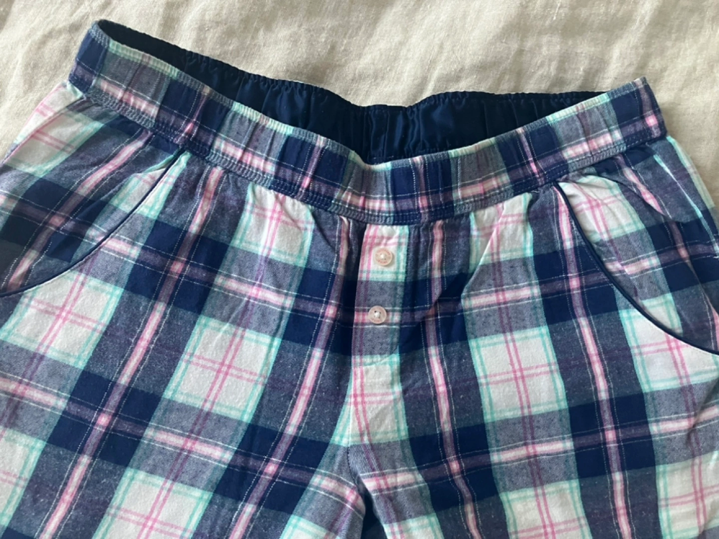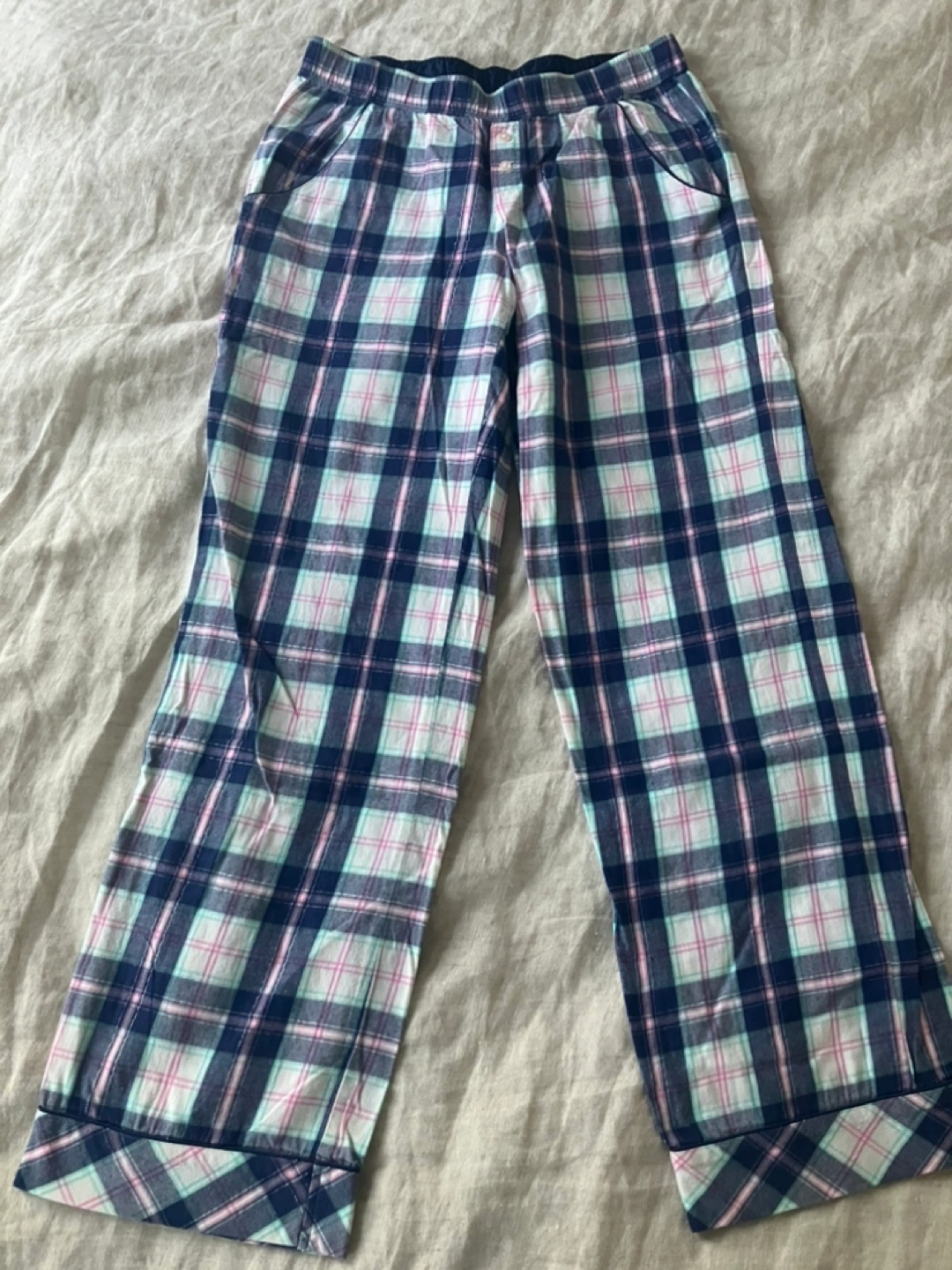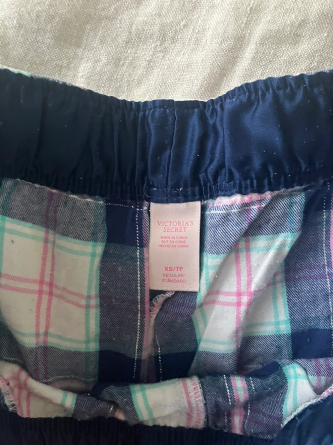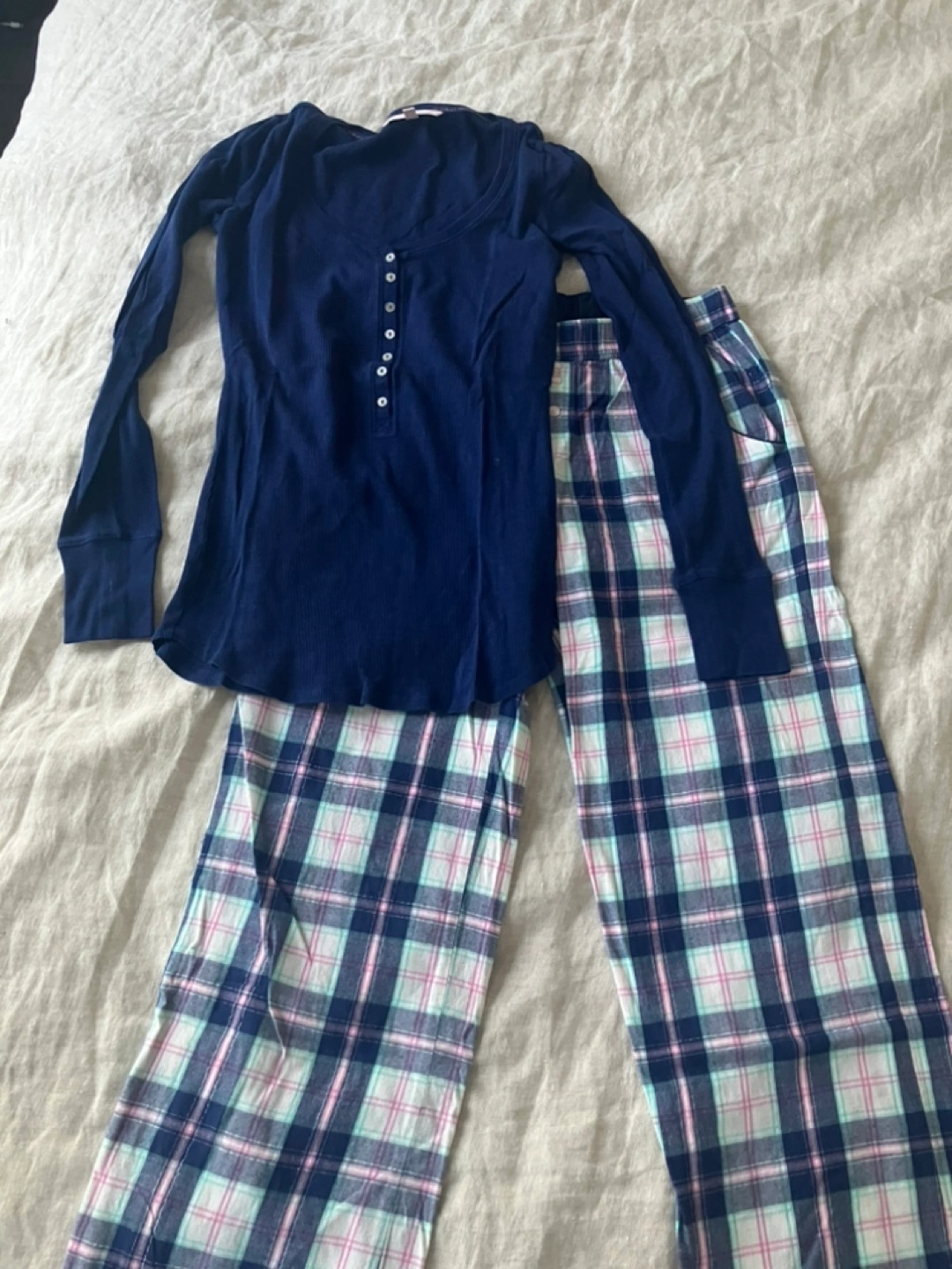 Women's pajama set. Navy top, plaid bottoms. Long sleeve henley top and plaid pants. Size XS. In very good condition.