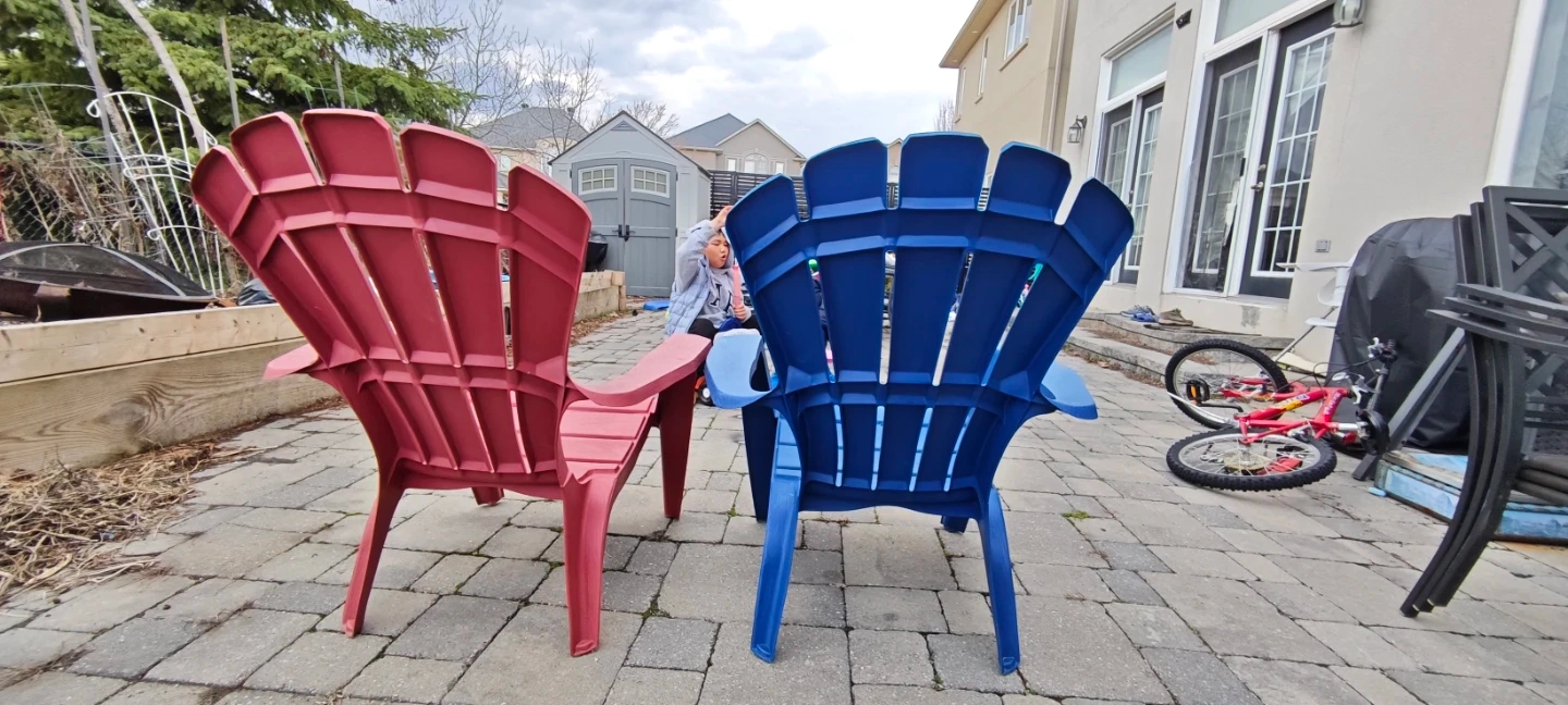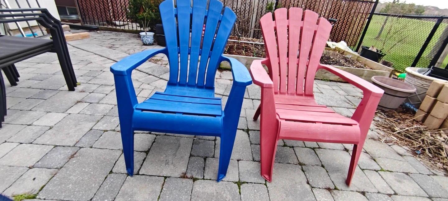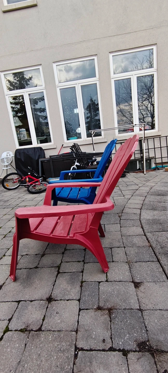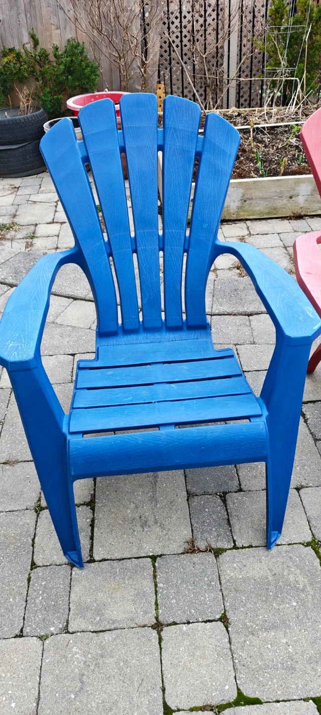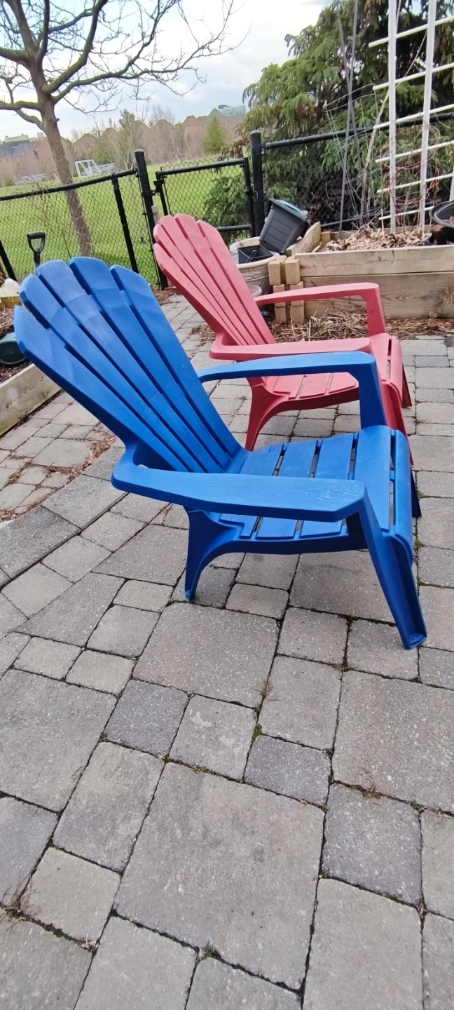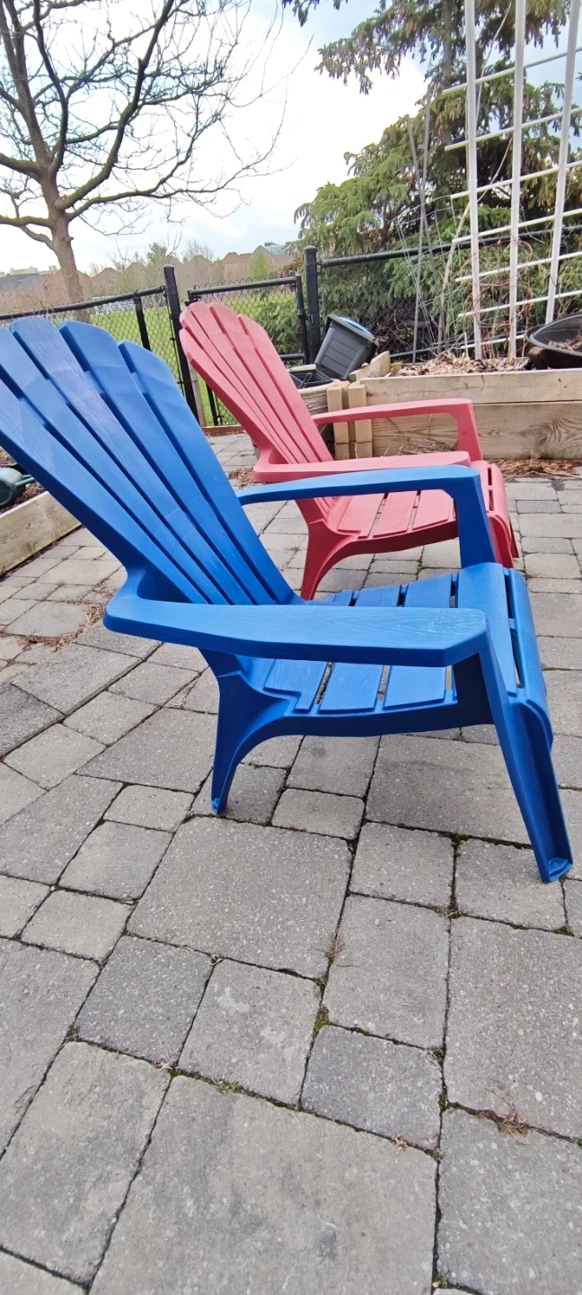 Two classic Adirondack chairs, one in blue and one in red. Made from durable plastic for outdoor use. These chairs offer a comfy spot to relax on your patio or in the garden.