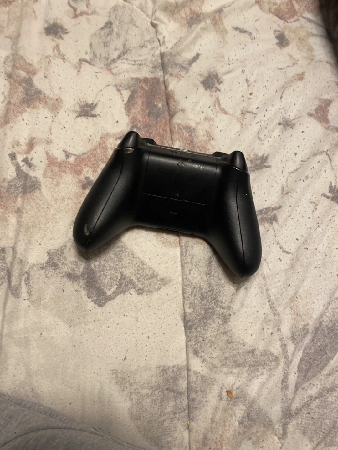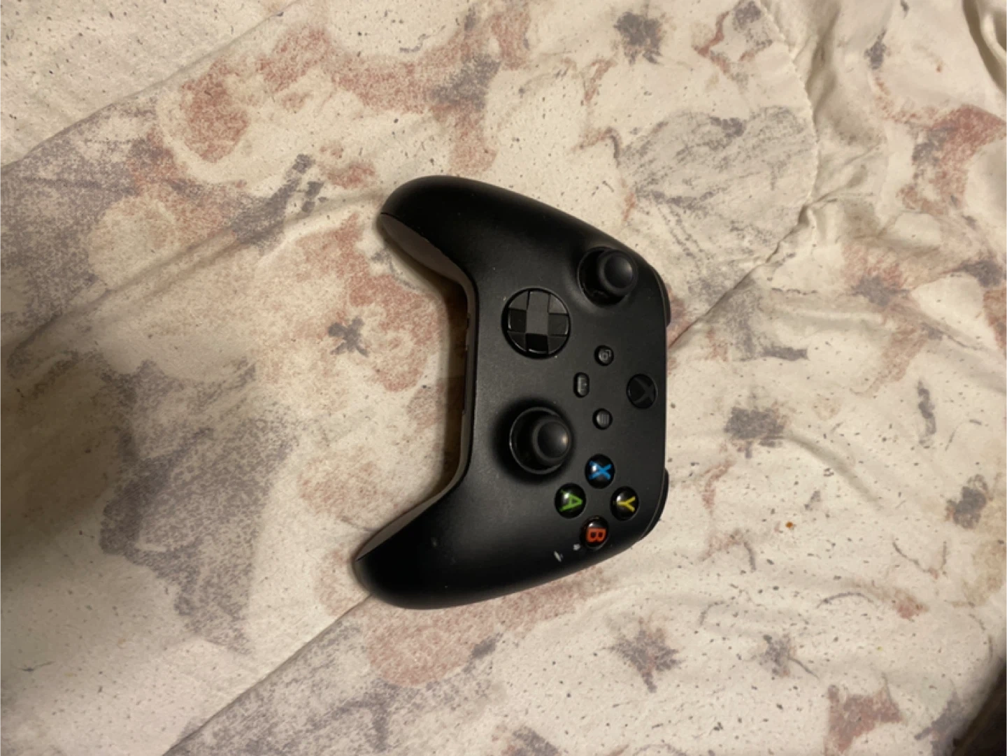 This is a black Xbox Wireless Controller. It features standard button layout with analog sticks and a directional pad. The controller's Xbox button glows blue when powered on.