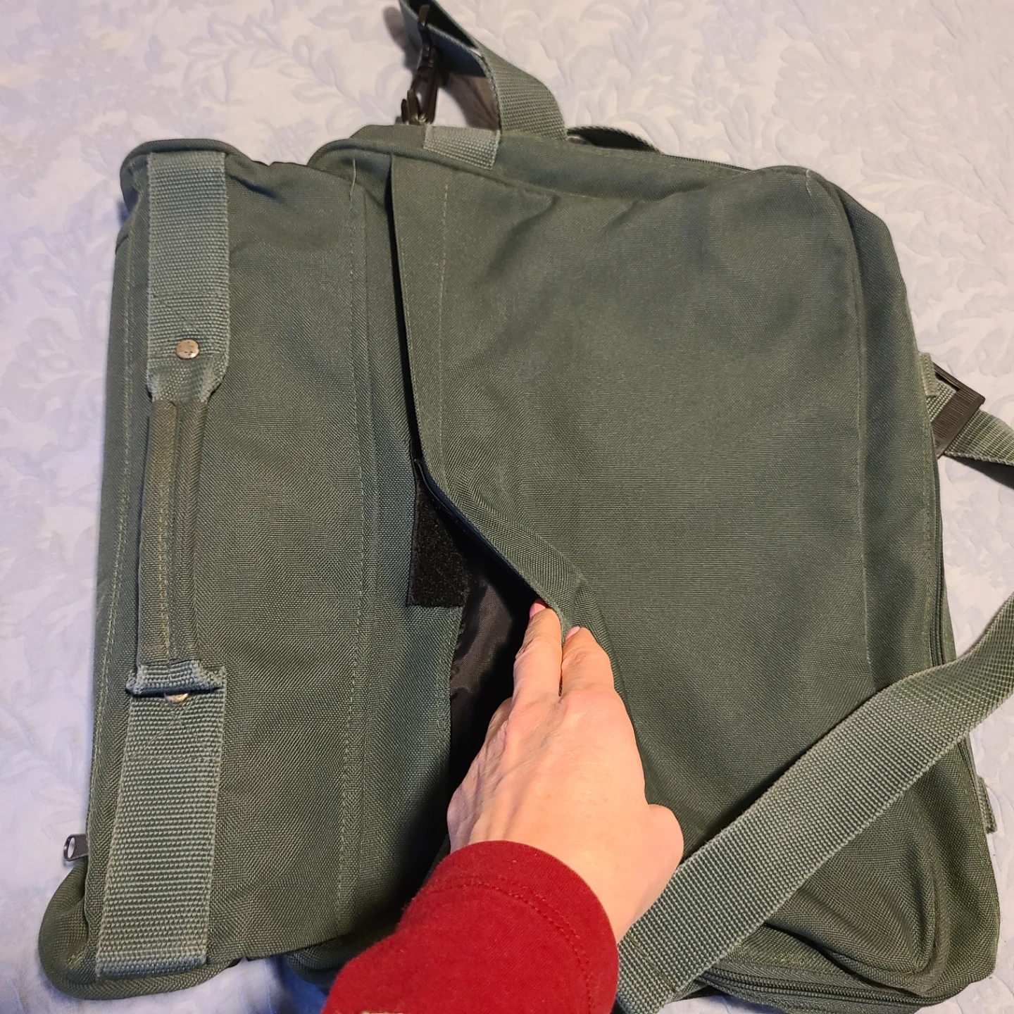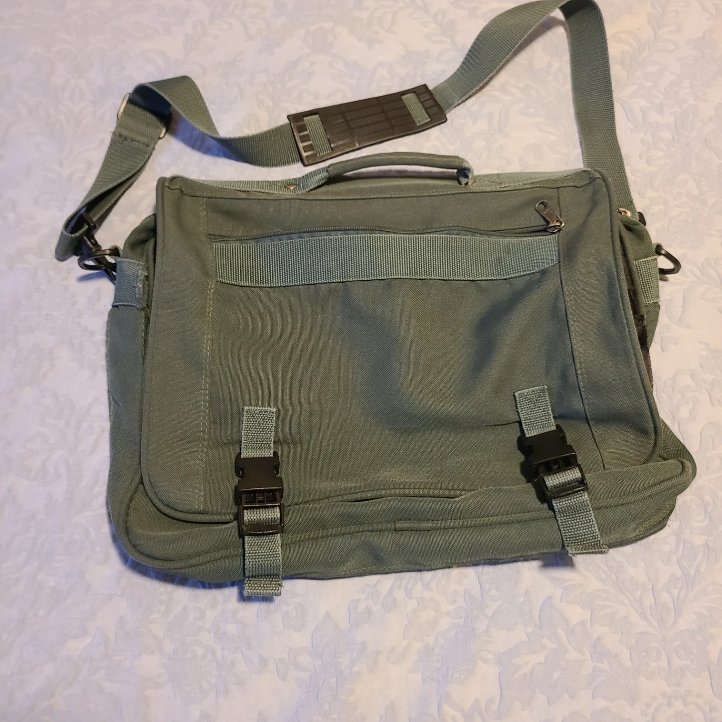 This green messenger bag is made of durable canvas. It has a main compartment with zippered pockets and an adjustable shoulder strap. Great for carrying books or a laptop.