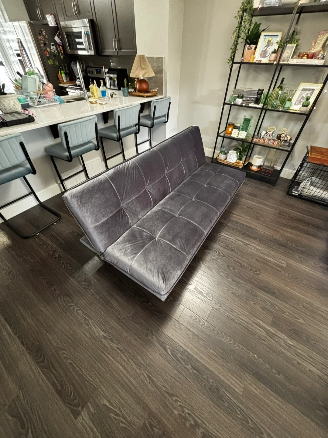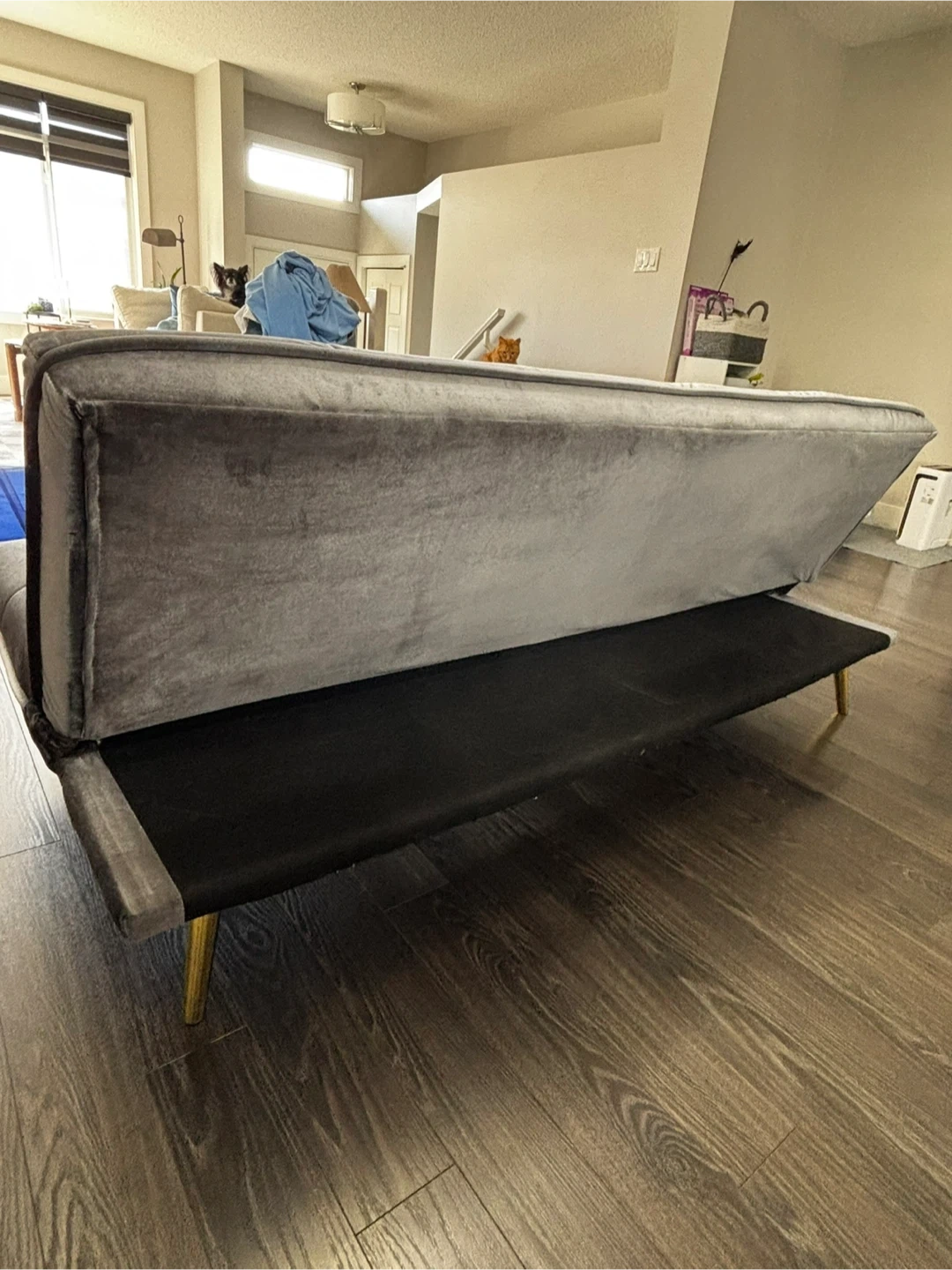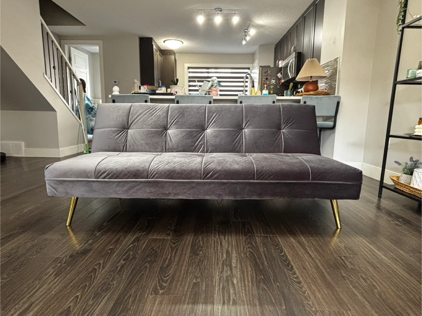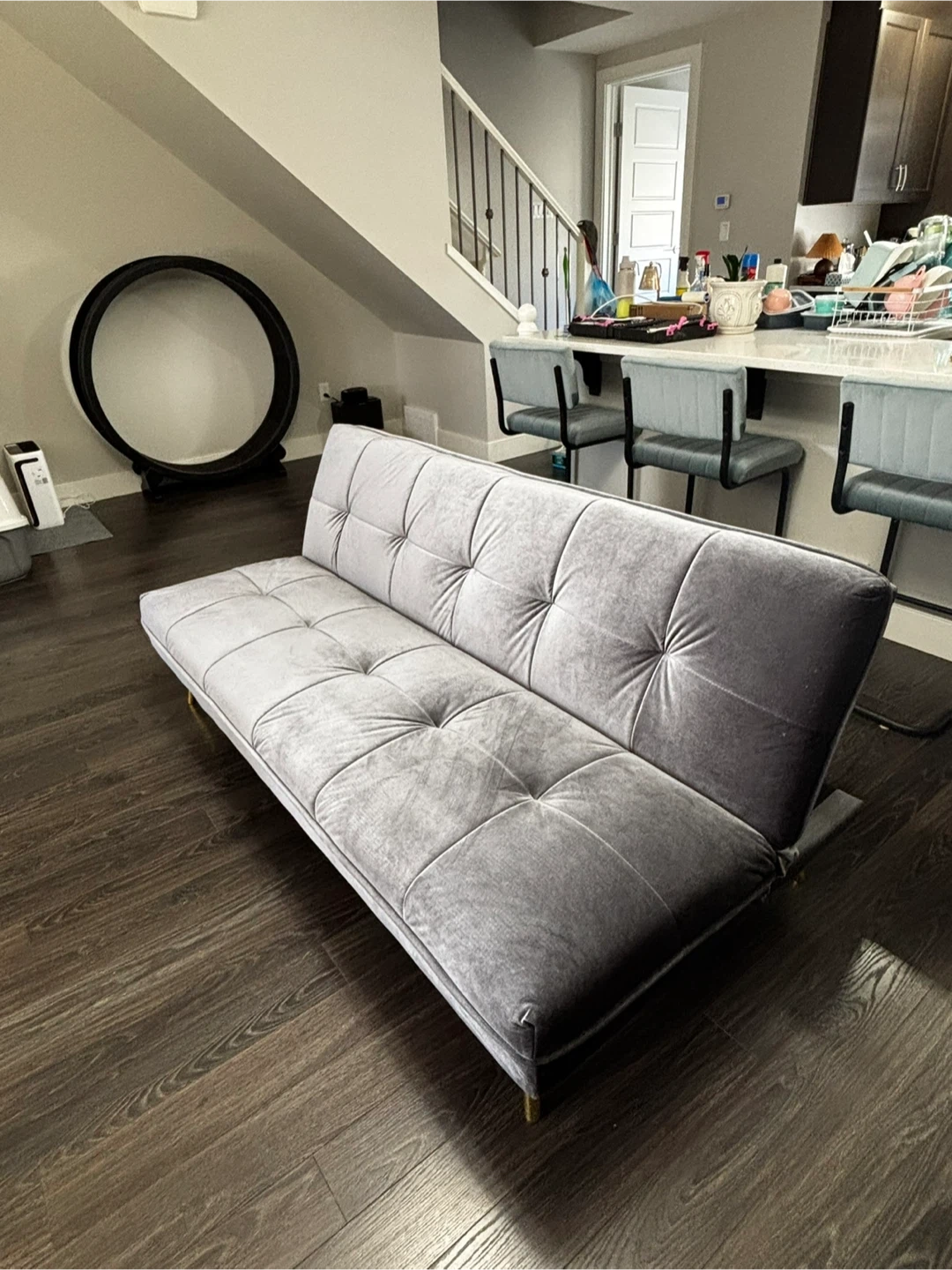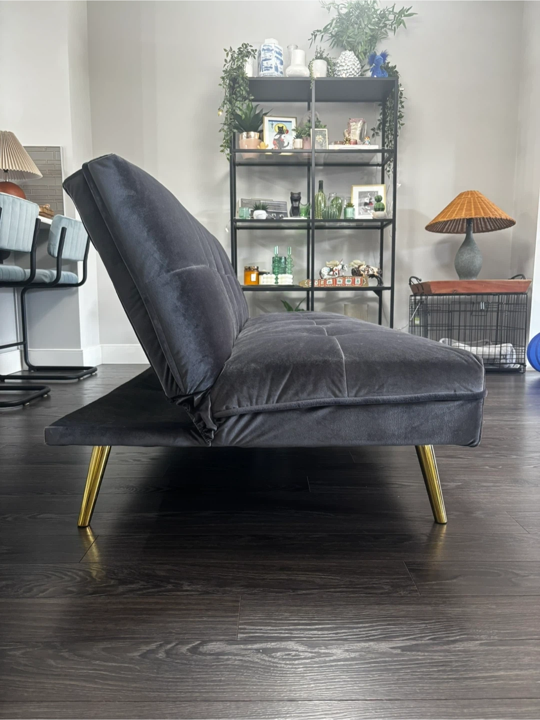 This grey velvet loveseat sofa bed features stylish tufted cushions and gold-toned legs. It's designed for comfort and convenience, easily converting from a sofa to a bed. Great for small spaces or guest rooms!