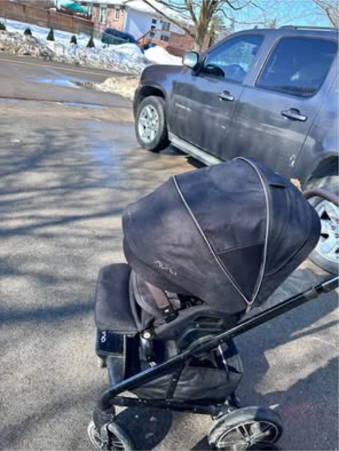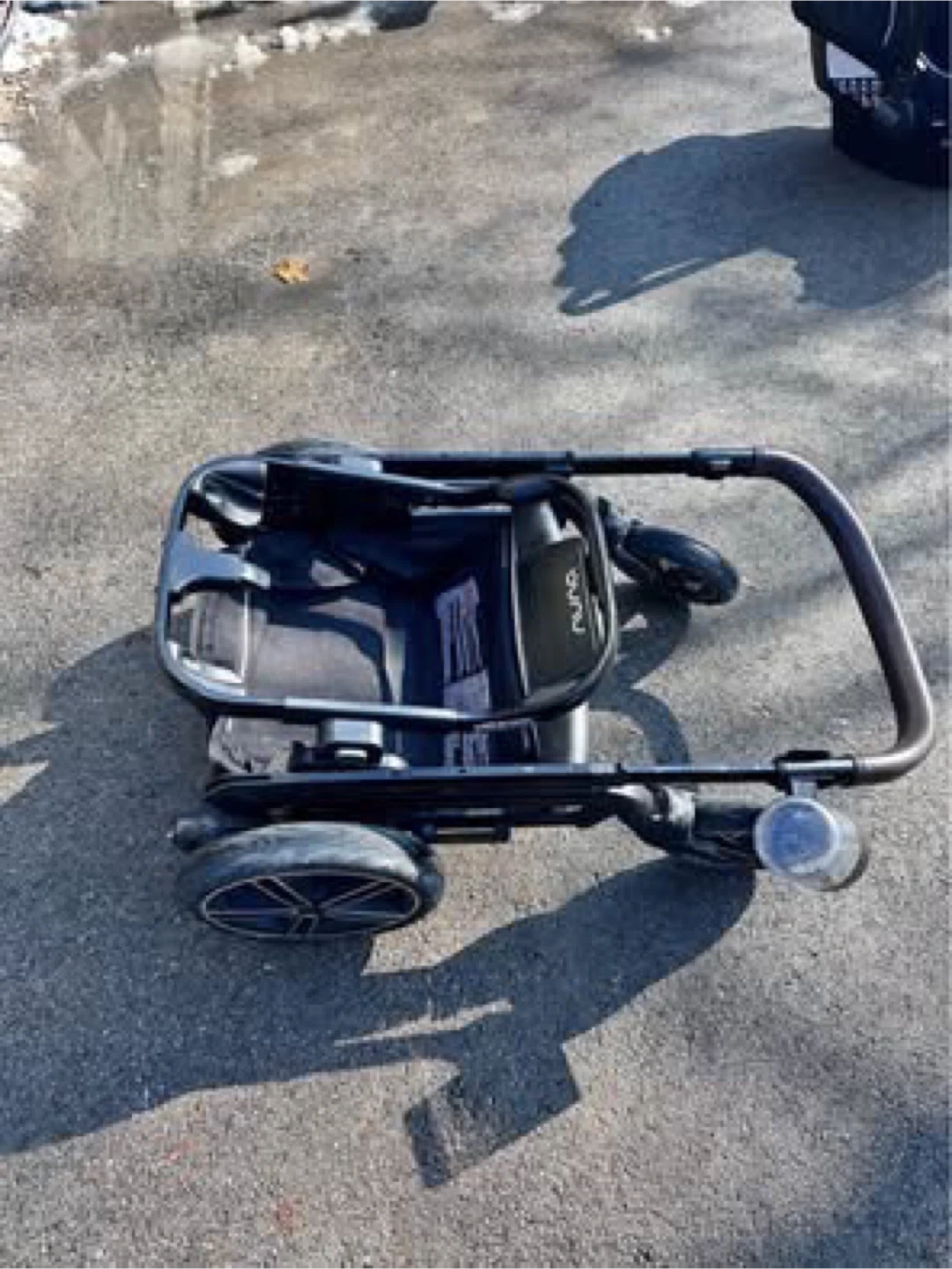 This is a Nuna Mixx stroller with a Nuna Pipa car seat. Both are black and in good condition. The stroller has a canopy and cup holder.