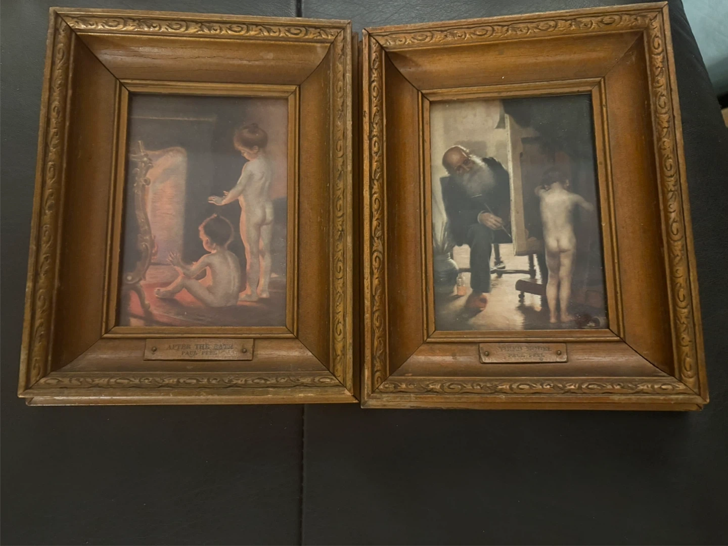 Two framed art prints, 'After the Bath' and 'Model', by artist Paul Peel. These are a lovely addition to any art collection. Ready to hang in your home! Real wood frames with artist brass plates. These are 7” x6” beauties price is firm for the pair