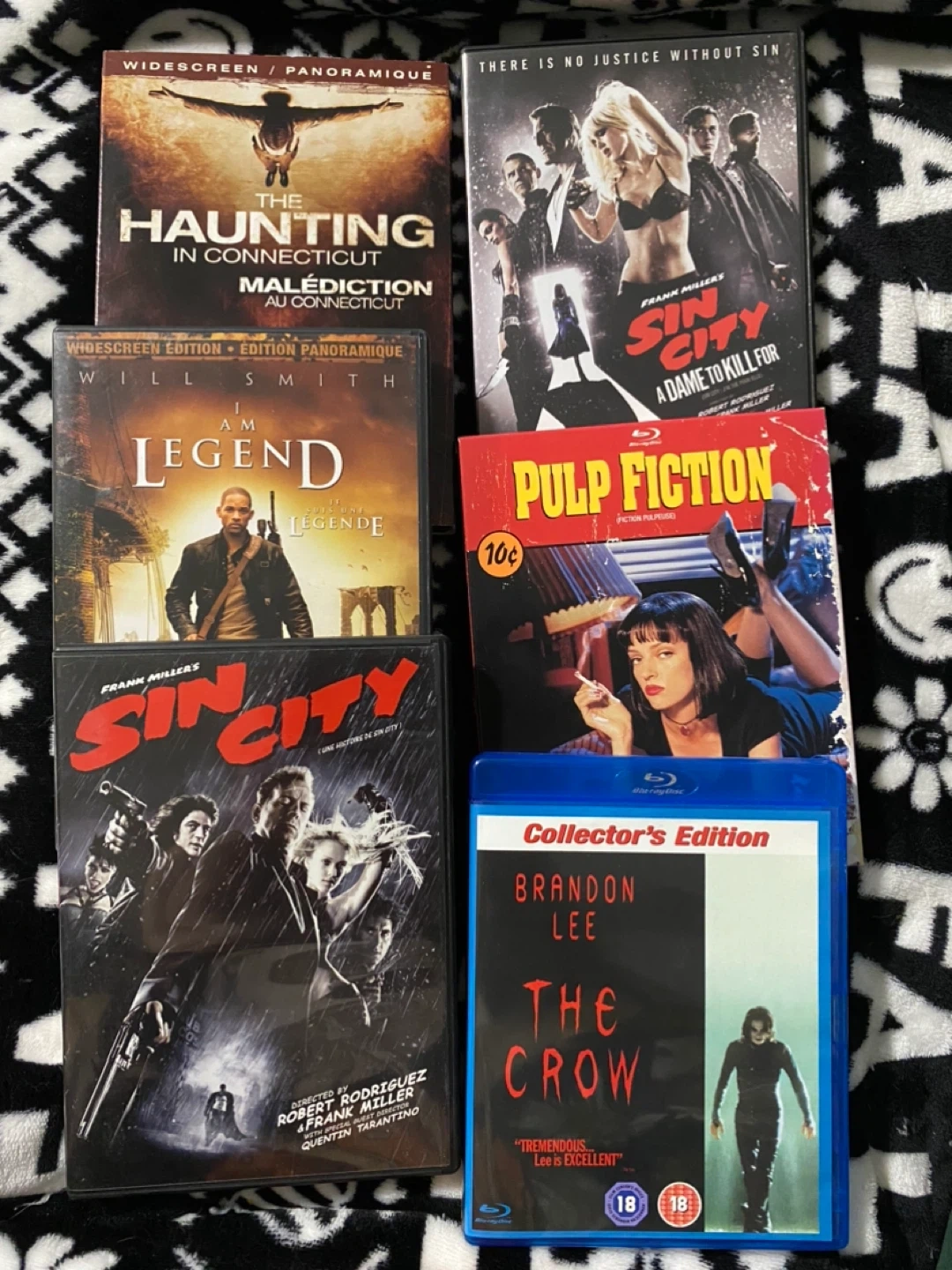 Selling a collection of DVDs and blu-rays including: - Sin City - I Am Legend - The Haunting in Connecticut - Sin City: A Dame to Kill For - Pulp Fiction (blu-ray) - The Crow (Collector's Edition - blu-ray) $5 each or $25 for all. Open to other offers.