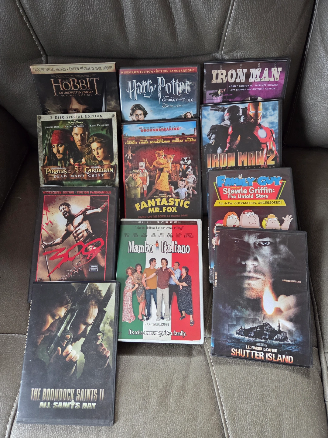 Selling a collection of DVDs including: - The Hobbit: An Unexpected Journey - Harry Potter and the Goblet of Fire - Iron Man - Iron Man 2 - Pirates of the Caribbean: Dead Man's Chest - Fantastic Mr. Fox - Family Guy: Stewie Griffin - The Untold Story - The Boondock Saints II: All Saints Day - Mambo Italiano - 300 - Shutter Island