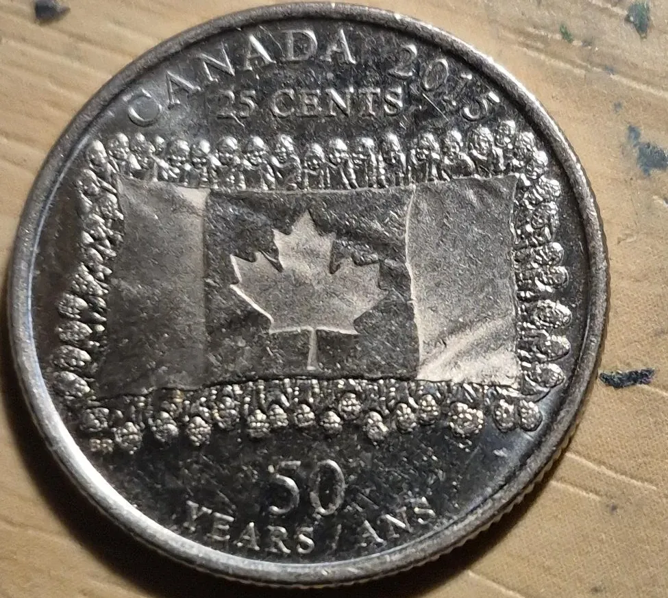 This is a 2015 Canadian 25 cent coin celebrating 50 years. It features a Canadian flag design. Made of metal.