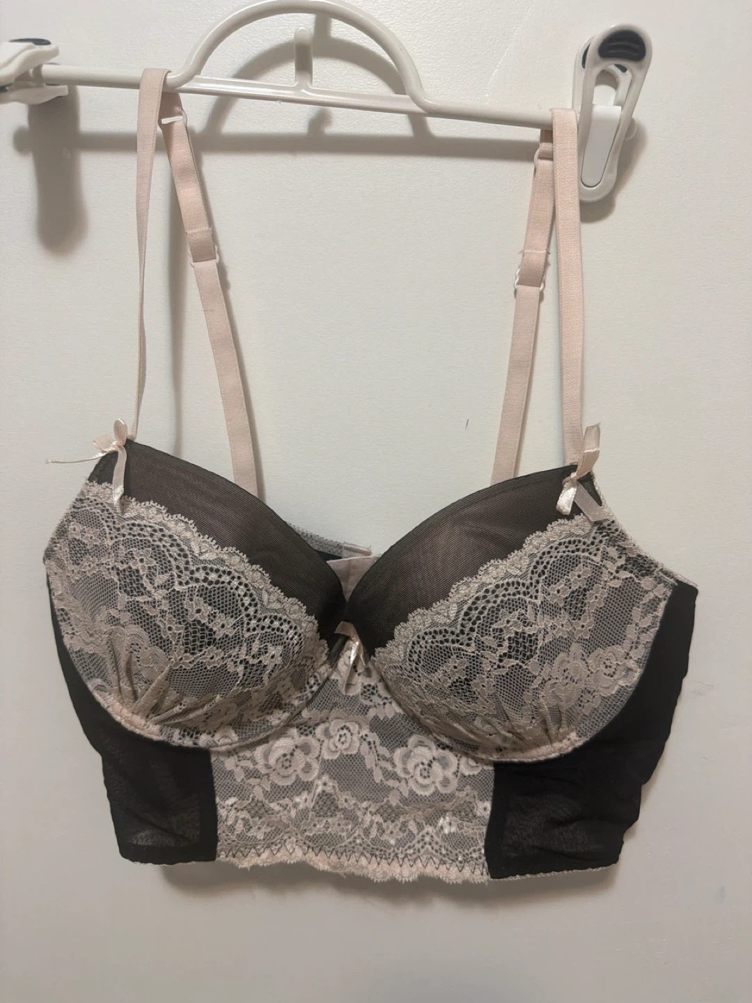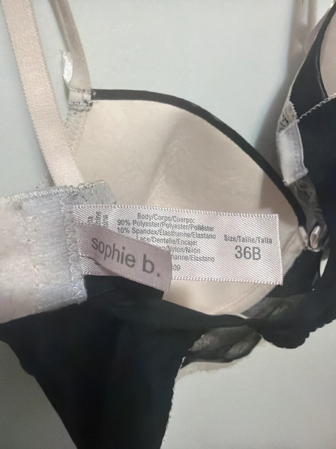This Sophie B. bra is a size 36B, featuring a black and nude lace design. It's made with 90% polyester, 10% spandex for the body and lace. The underwire and full coverage cups offer support. It has adjustable straps and a back closure.