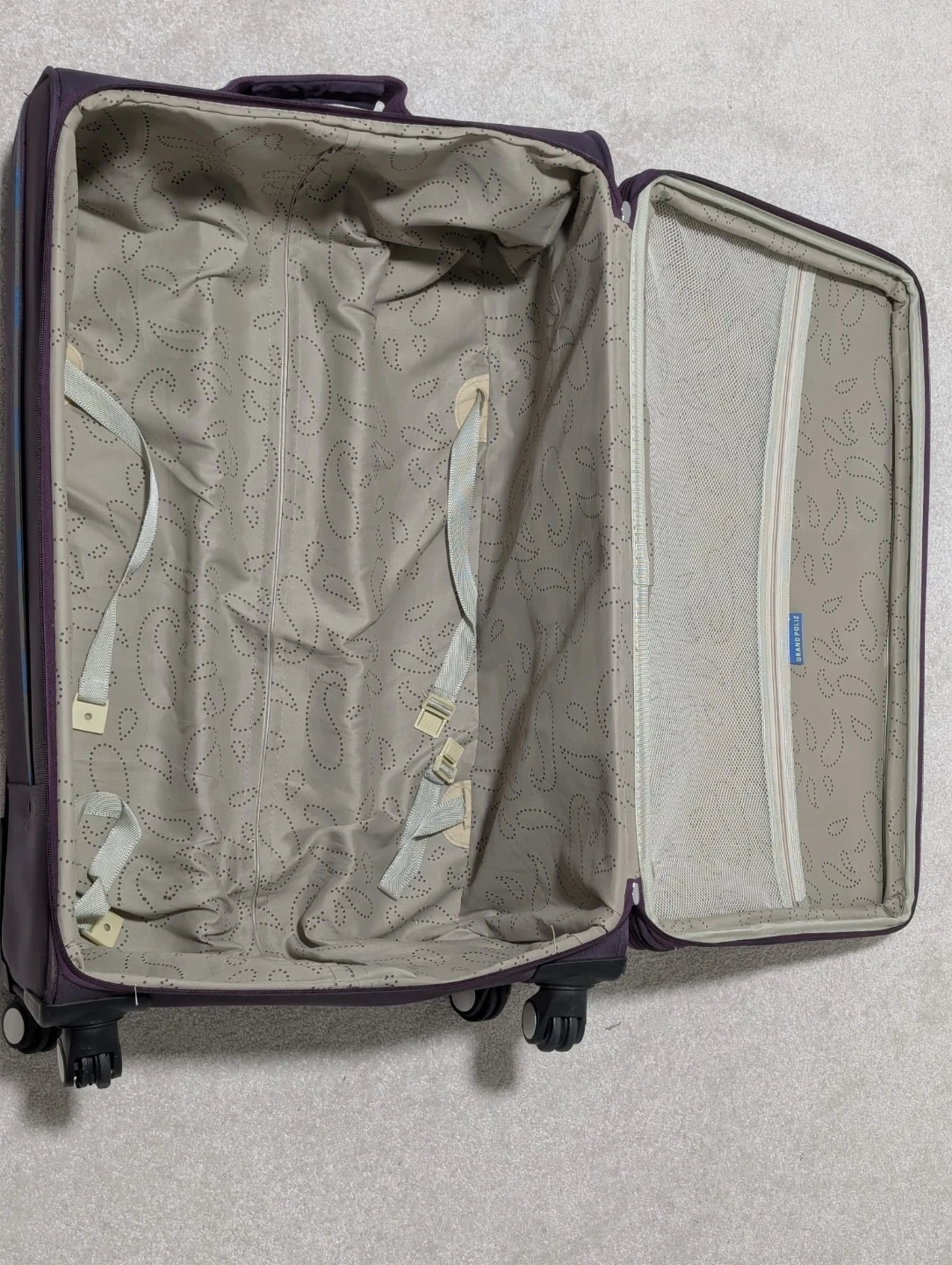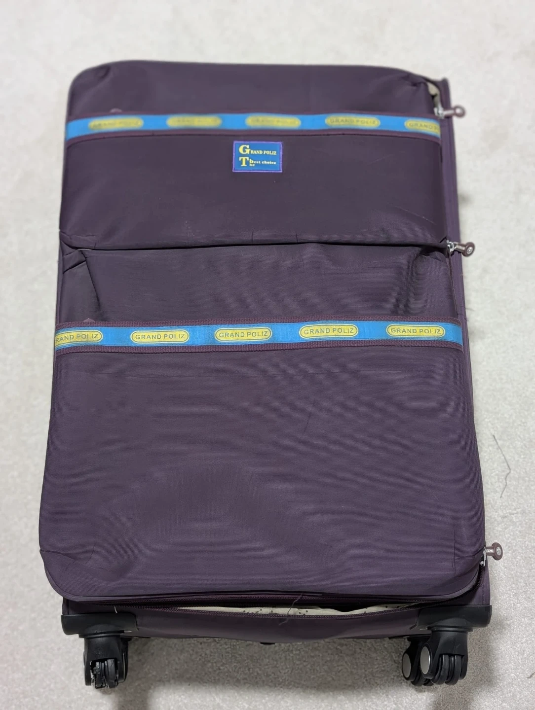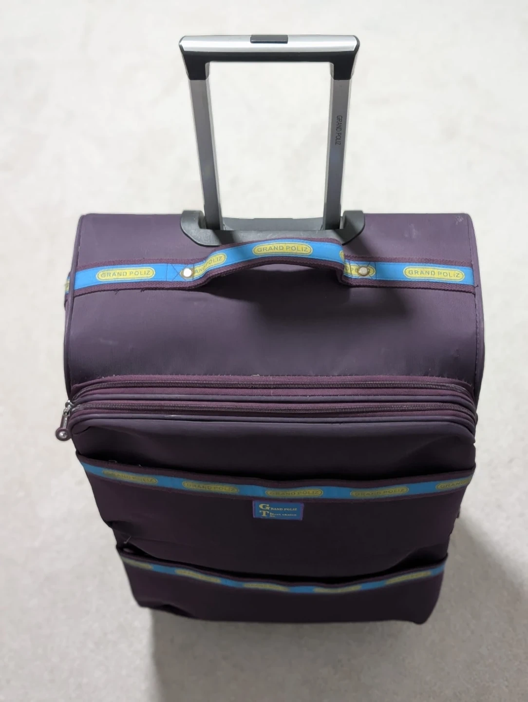 This is a Grand Poliz purple rolling suitcase. It features an extendable handle and interior straps for securing belongings. The exterior is durable fabric with multiple zippered compartments. Great for your next trip!