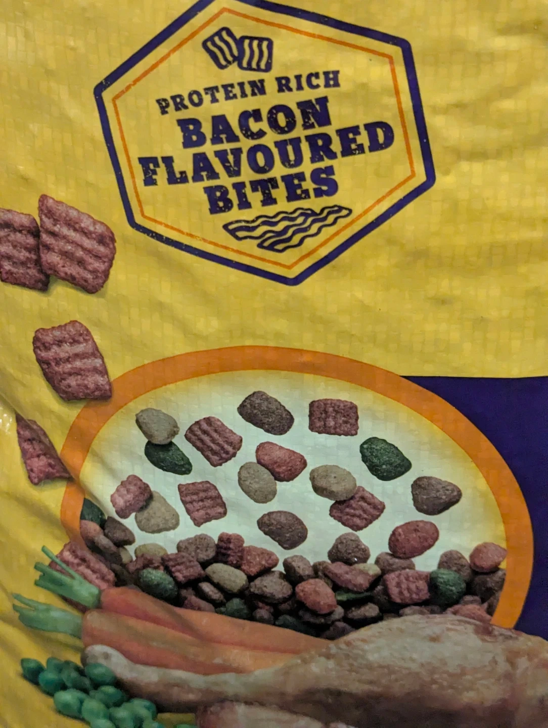 This Pedigree dog food is made with roasted chicken and vegetable flavour and bacon-flavoured bites. It's protein-rich and contains 36 vitamins, minerals, and amino acids. Food is for adult dogs.