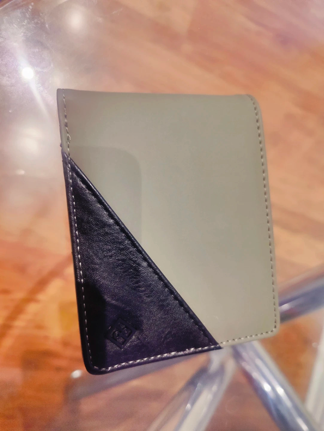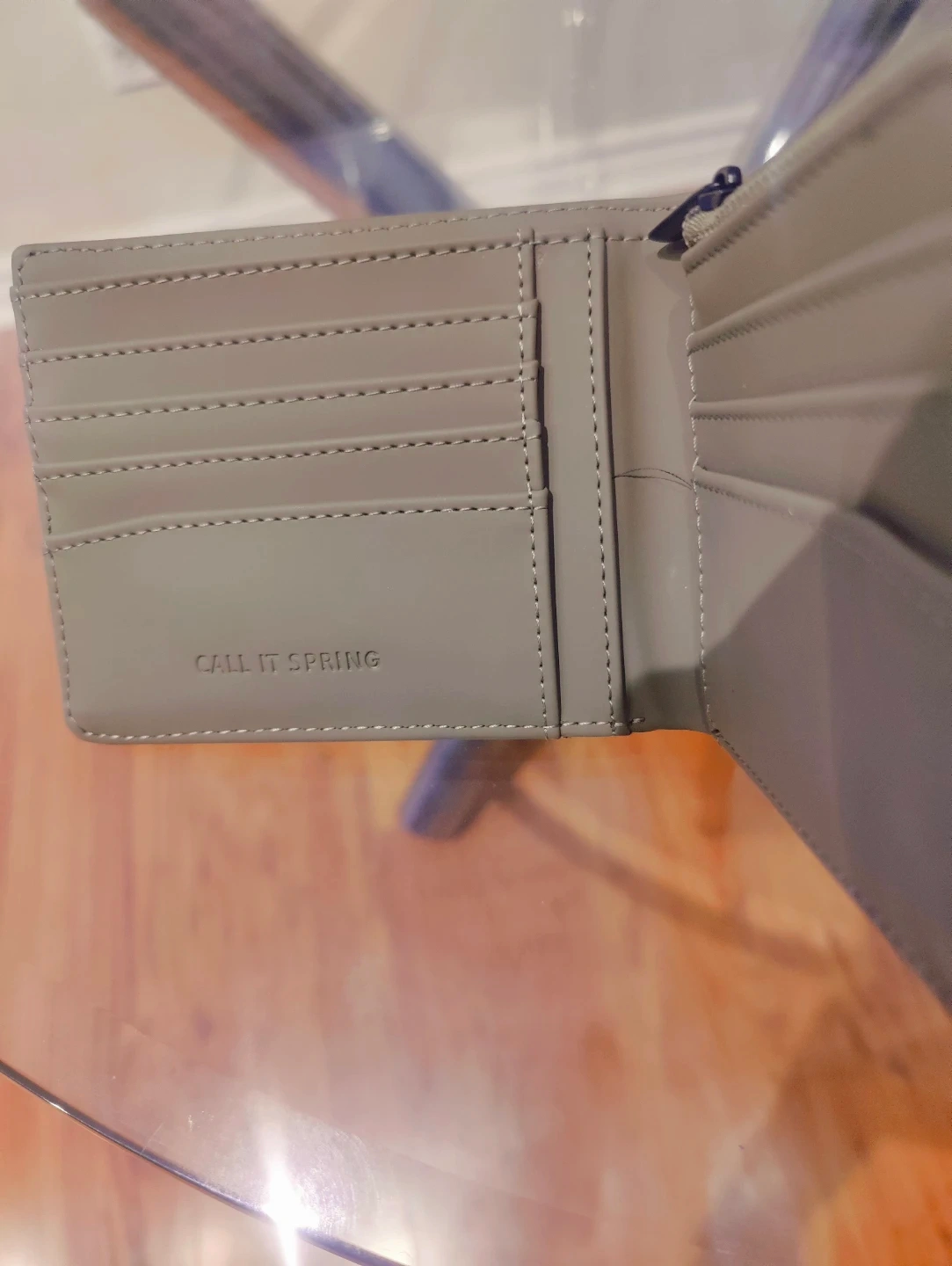 A bifold wallet from Call It Spring. It features a two-tone design with multiple card slots and a zippered coin pocket. Wallet is in great condition! Vagen material . Non Leather.
