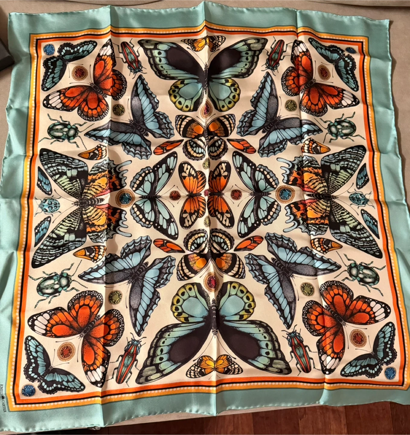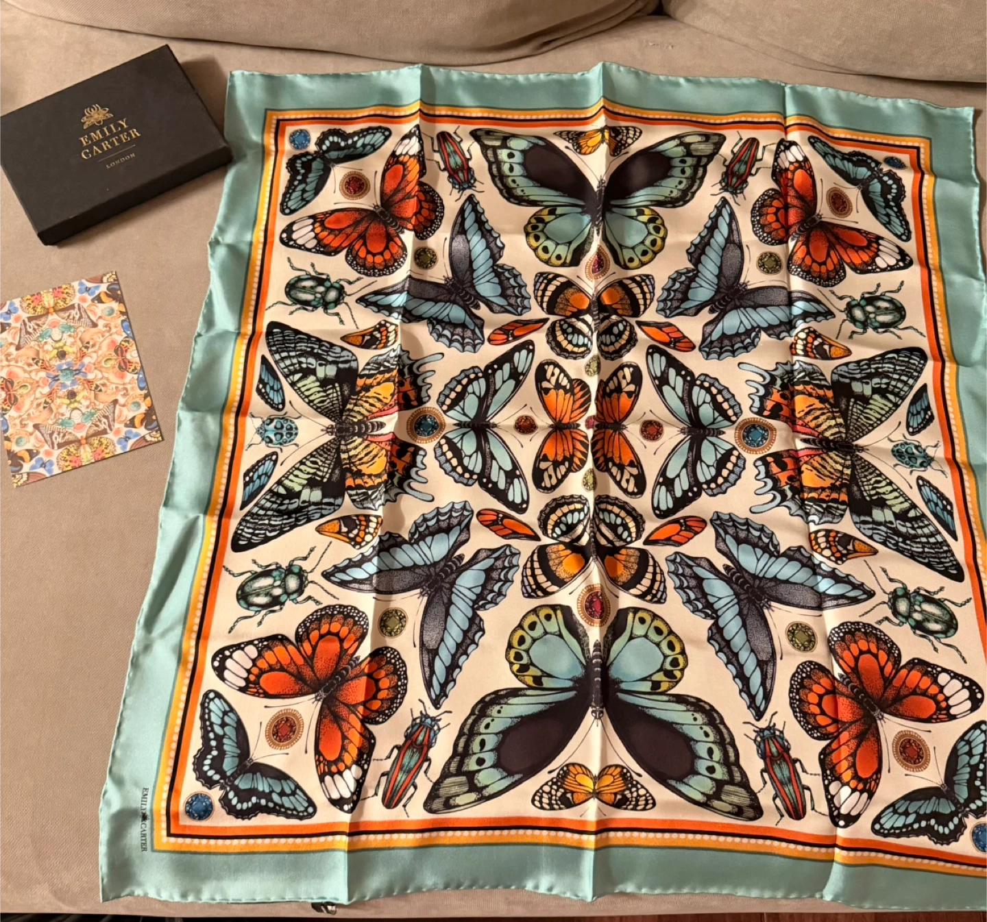 This beautiful silk scarf features a vibrant butterfly and insect print. It's made in England with fine craftsmanship. The scarf comes in its original Emily Carter gift box, perfect for a thoughtful present!
