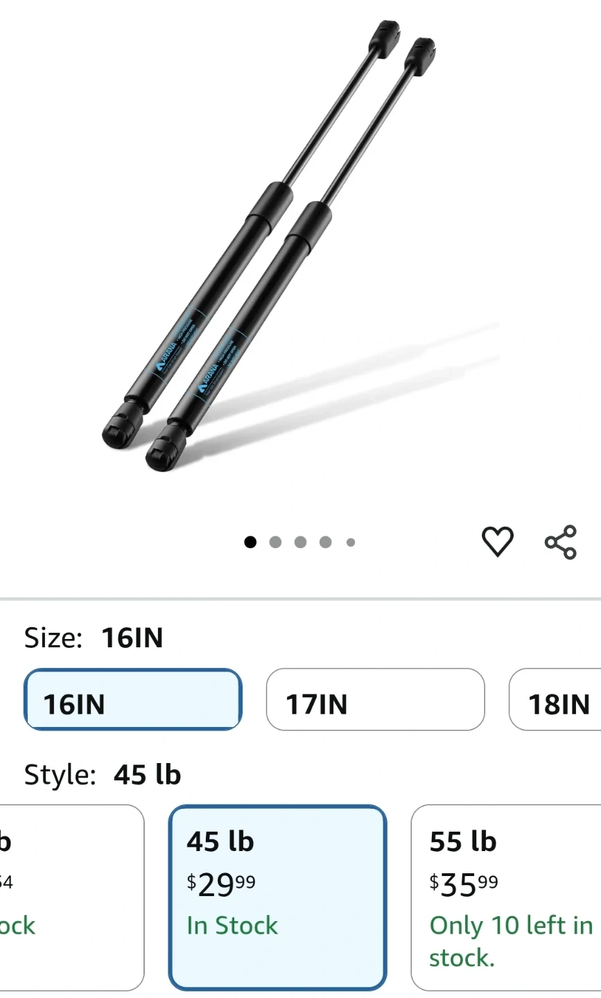 Brand new ARANA gas struts, 16 inches long with a 45lb lift support Including mounting hardware.