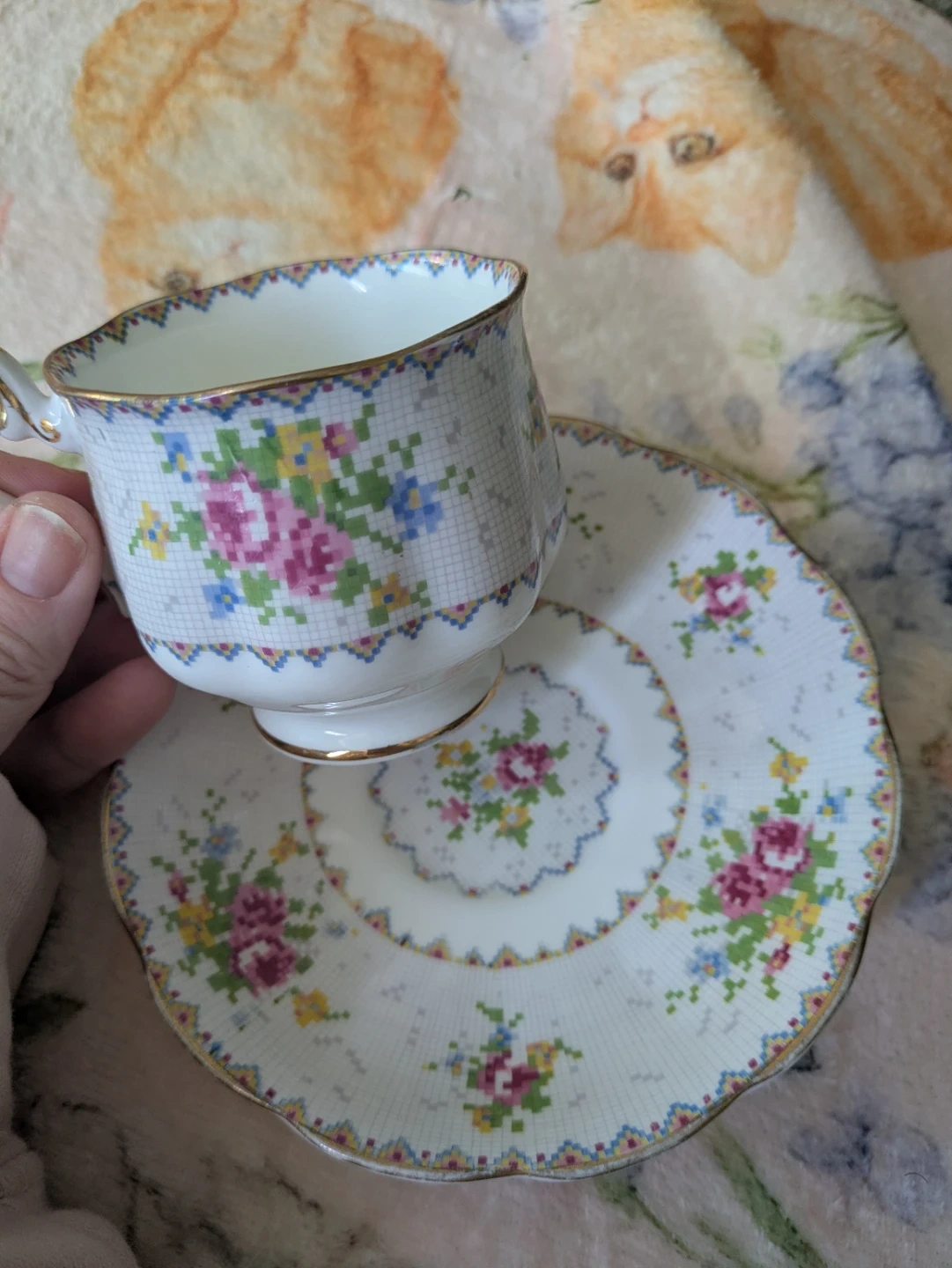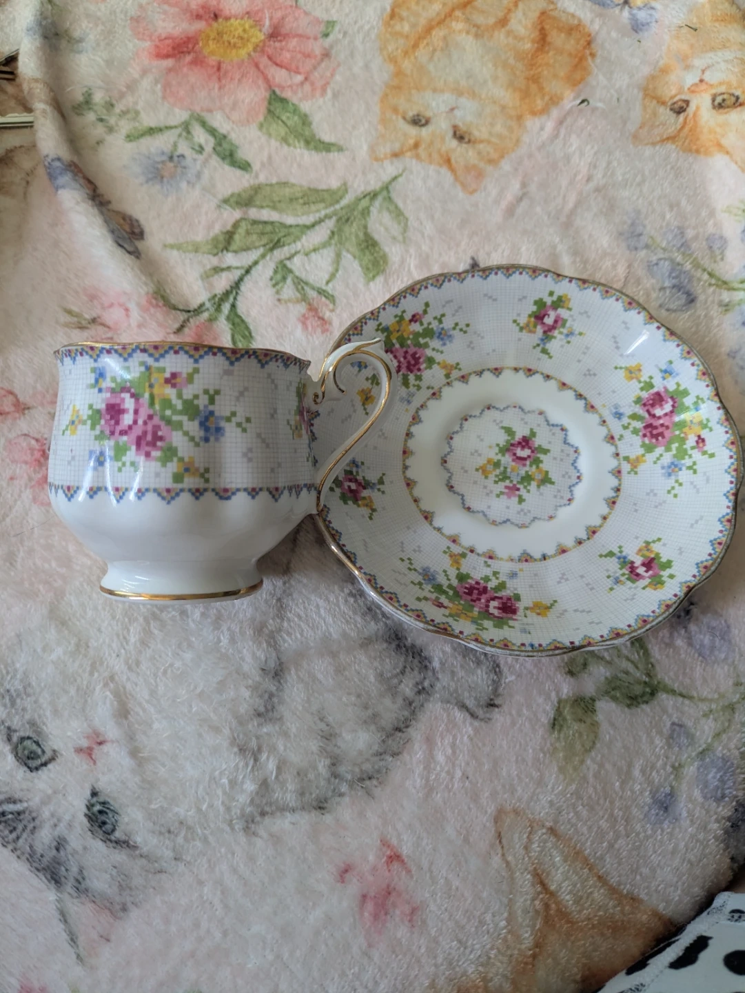 This is a vintage Royal Albert "Forget Me Not" teacup and saucer set from England. It's made of fine bone china with a pretty floral design that resembles cross-stitch. This set is perfect for enjoying a nice cup of tea!