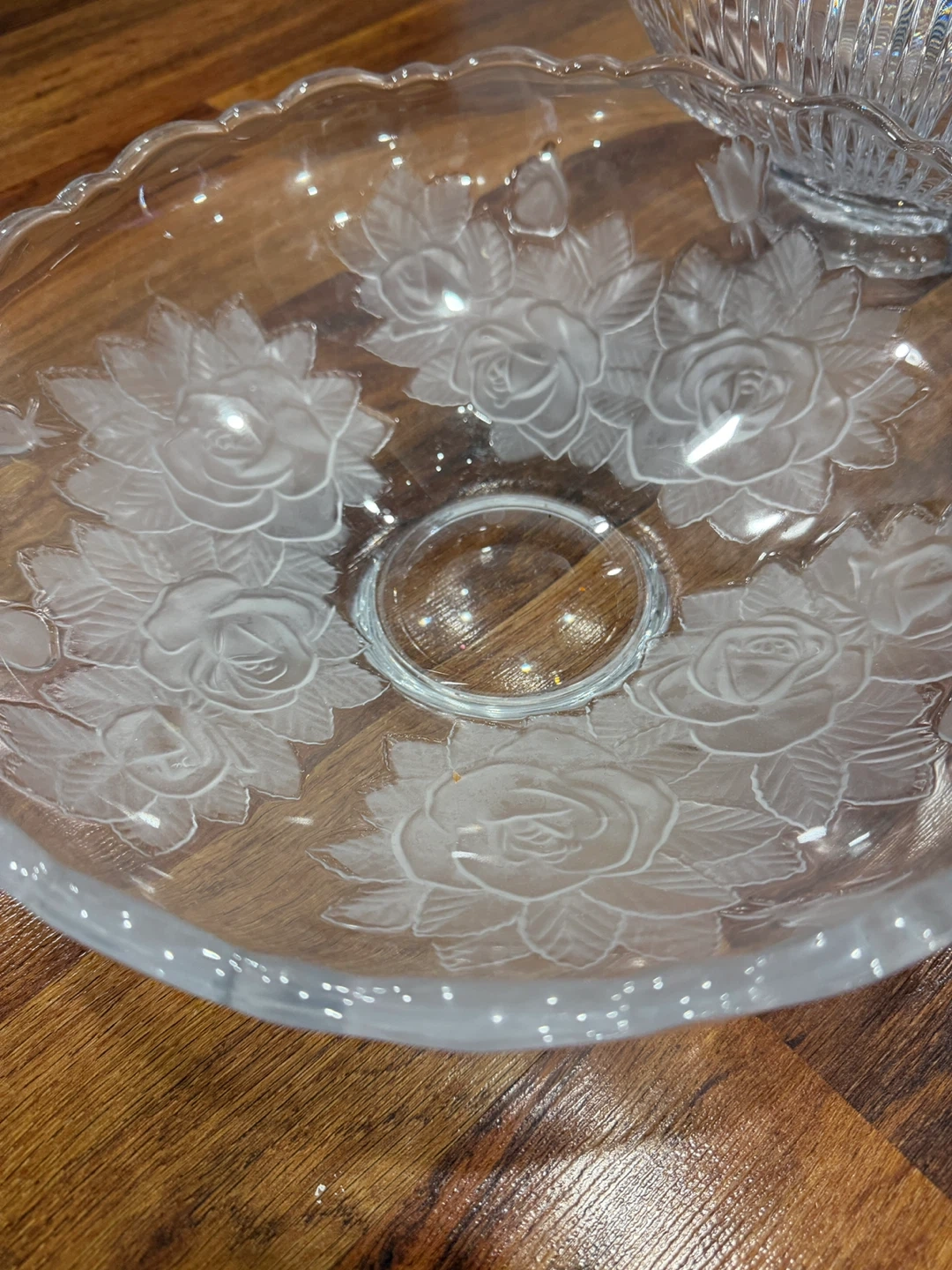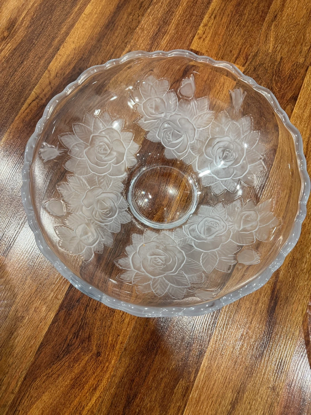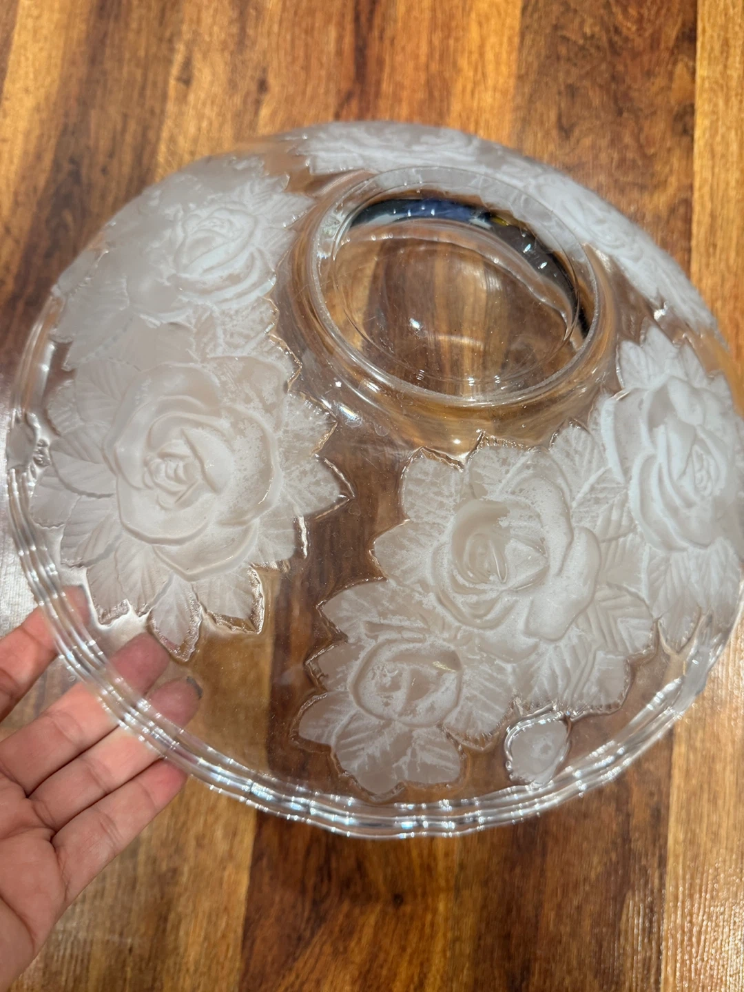 A clear glass fruit bowl featuring an embossed rose pattern. It's a lovely piece for serving or display. Ideal for adding a touch of elegance to your kitchen or dining table.