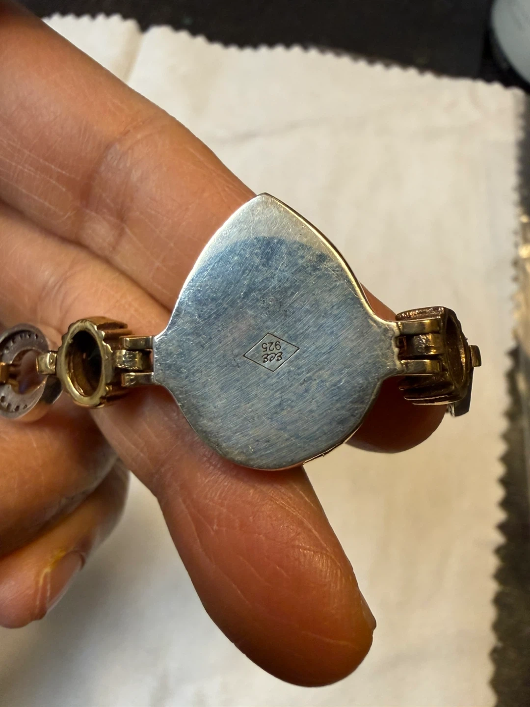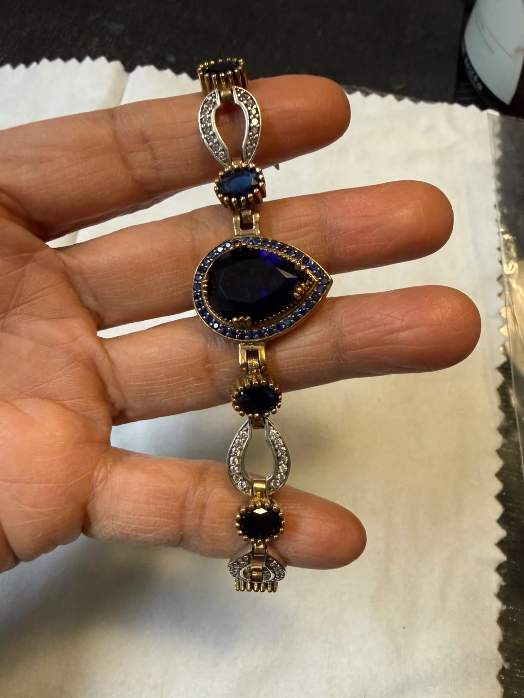 Elegant 6 3/8” bracelet featuring a large pear-shaped blue stone surrounded by smaller blue stones. The back of the main stone shows a '925' stamp, 925 stamped and copper 6 3/8” Bracelet with Blue Stones sterling silver with copper. It's a beautiful statement piece!