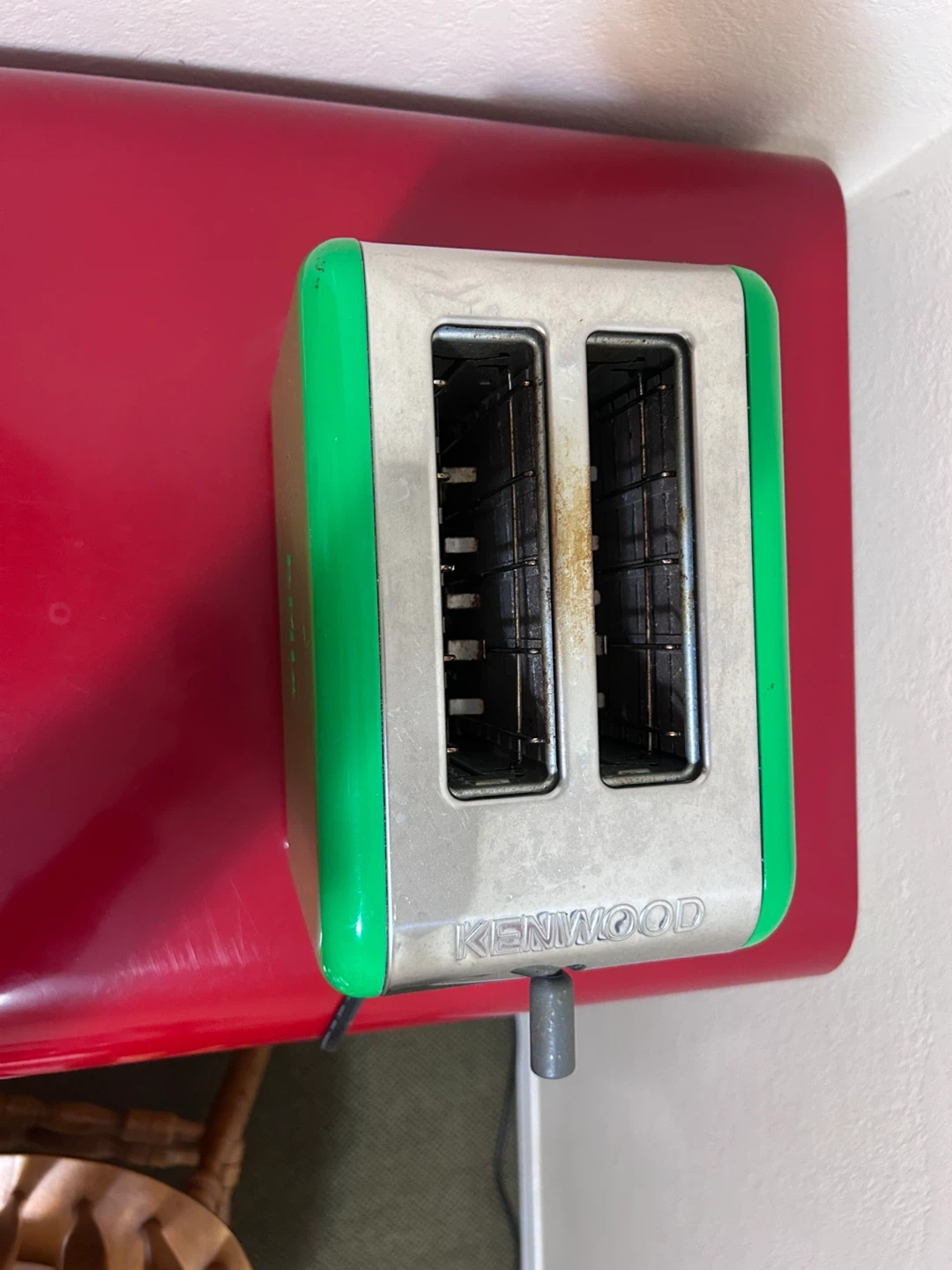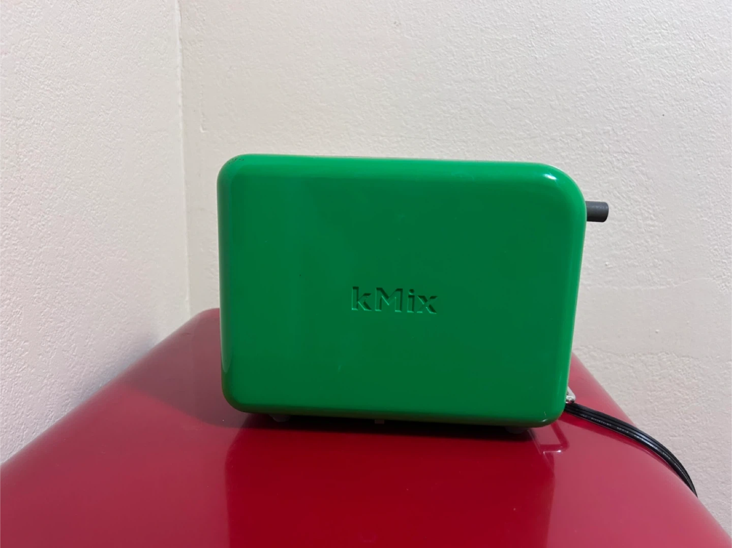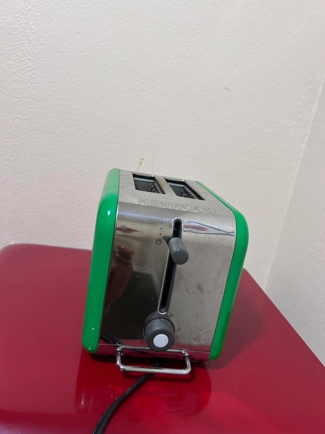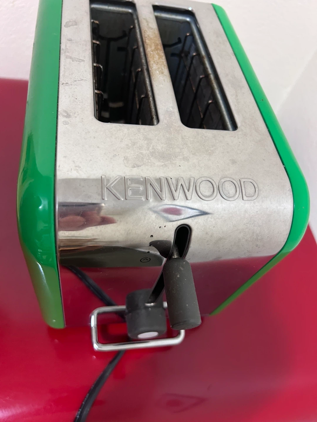 Kenwood kMix 2-slice toaster in a vibrant green colour. It's made with a durable brushed stainless steel and plastic construction. Perfect for making toast for two!