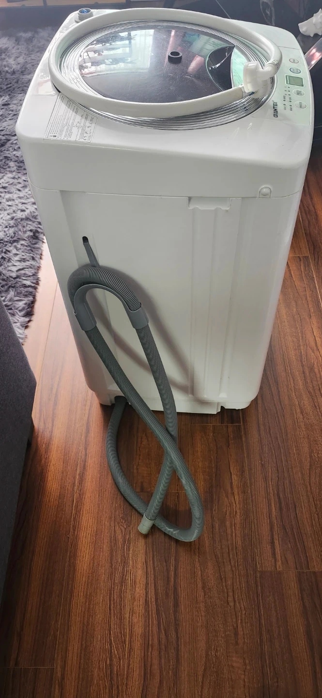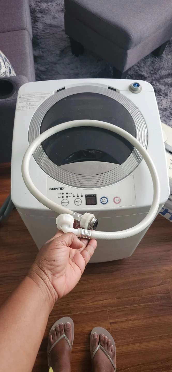 This is a GIANTEX portable washing machine. It comes with a water inlet hose and a drain hose. It features multiple wash settings including soak, wash, and spin.