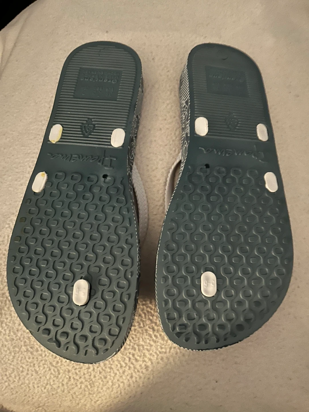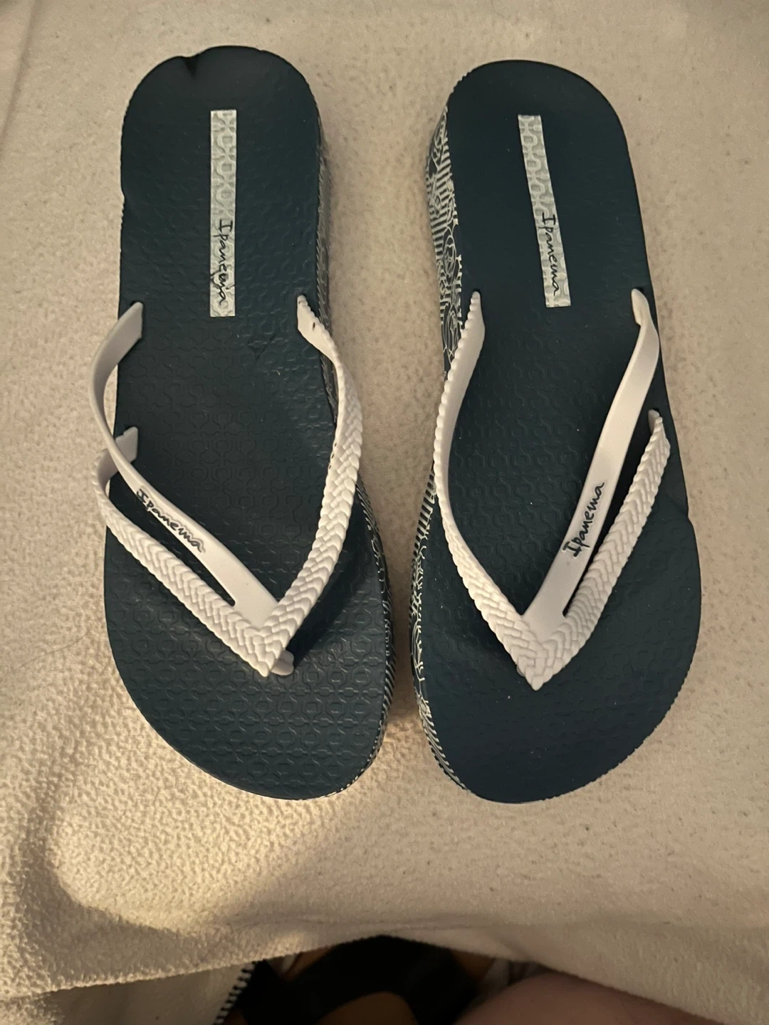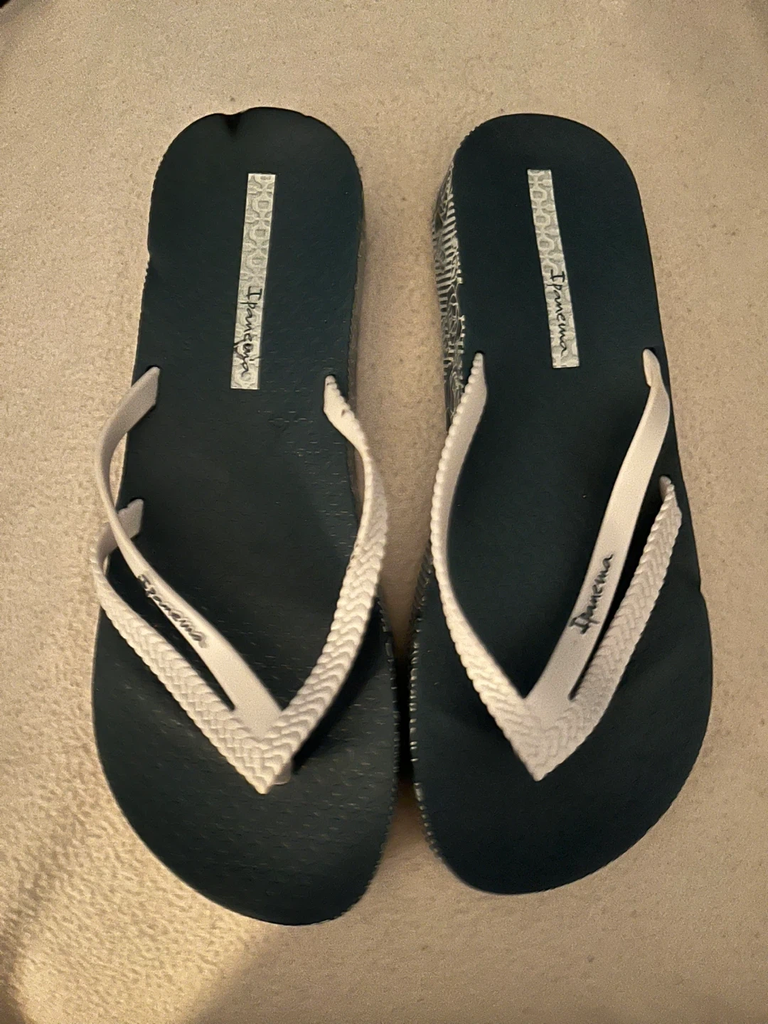 Dark teal Ipanema flip flops with white braided straps. Rubber soles provide good grip. Perfect for beach days or casual wear!