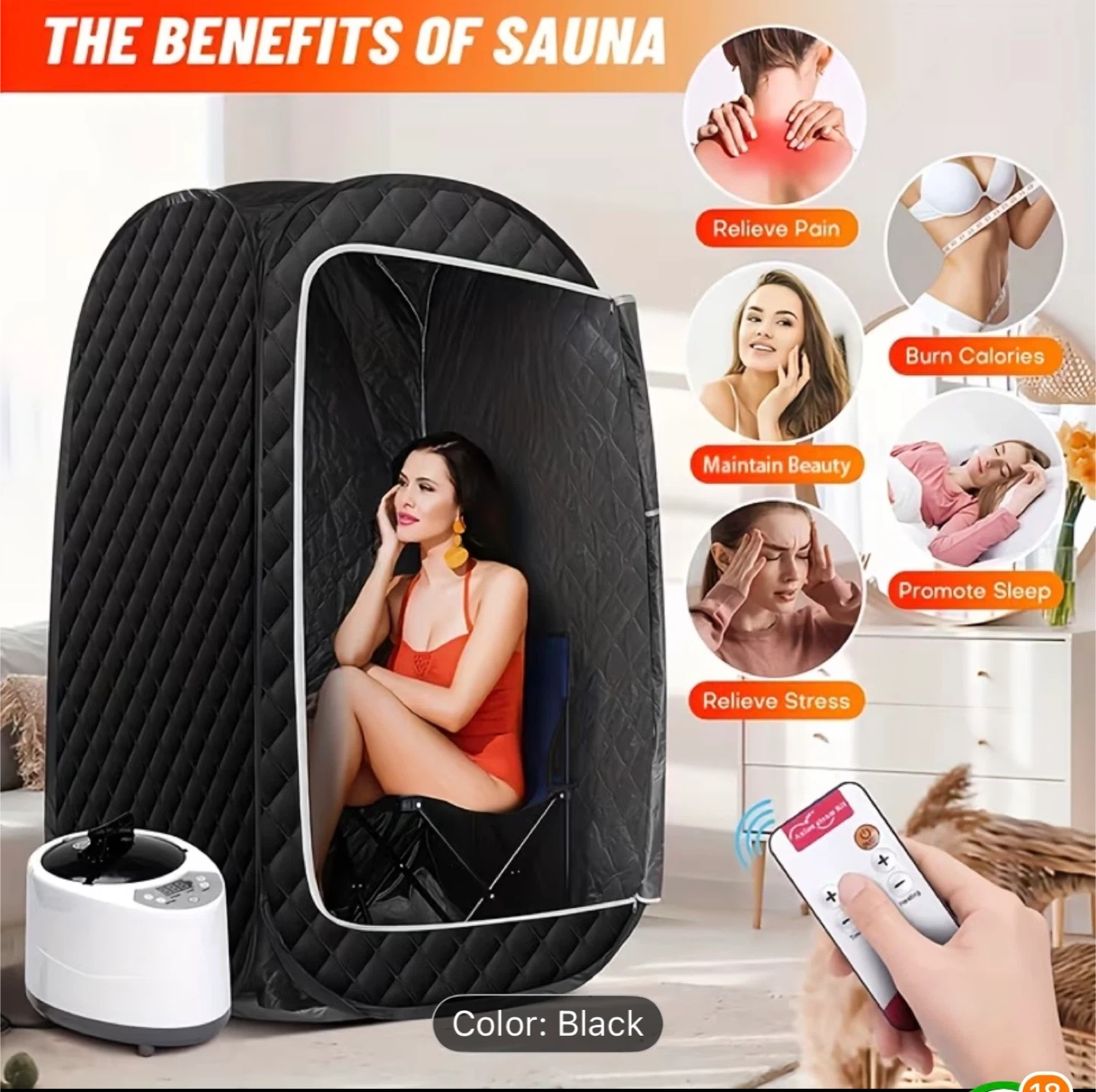 This portable sauna kit includes a black tent and a 1000W steamer unit. The tent measures 80cm x 80cm x 136cm and features a stainless steel inner lining. Max temperature is 120°F with a 99-minute timer. It's great for home use!