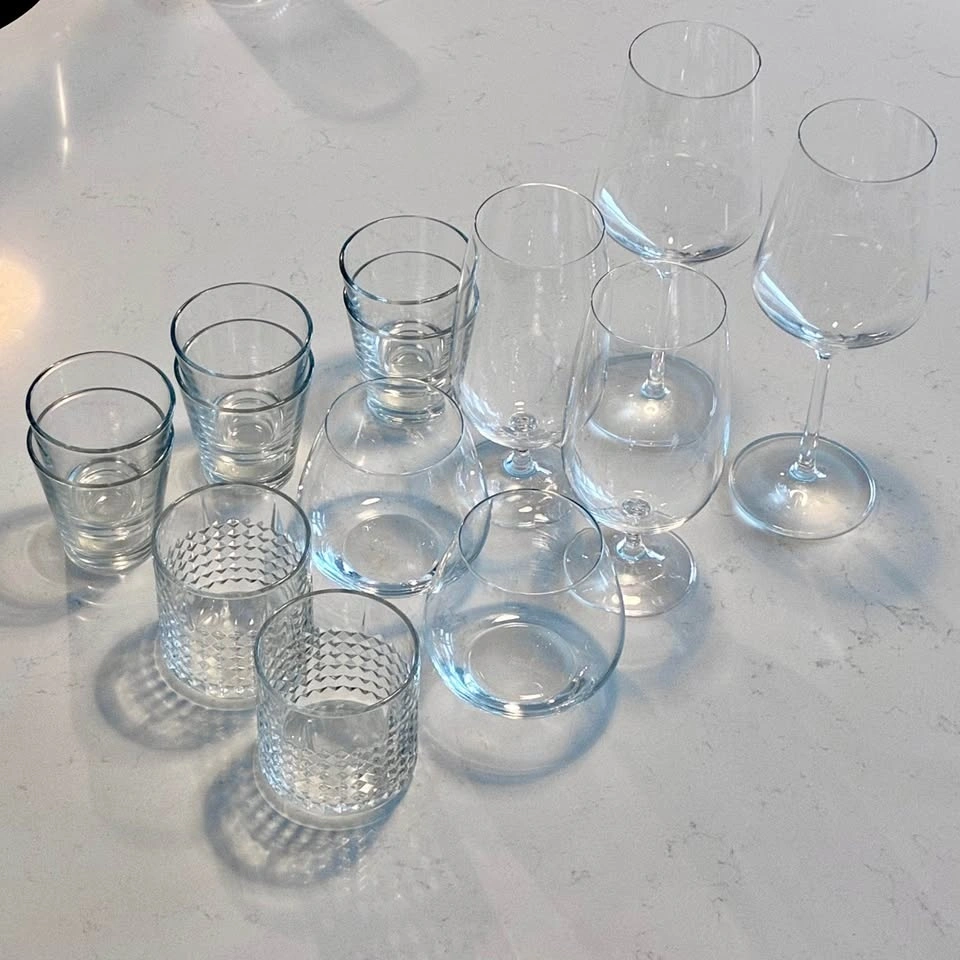 Versatile glassware set with a mix of stemmed wine glasses, stemless tumblers, and regular tumblers. Also includes a couple of cool textured tumblers. Total of 14 glasses. Great for entertaining or everyday use.