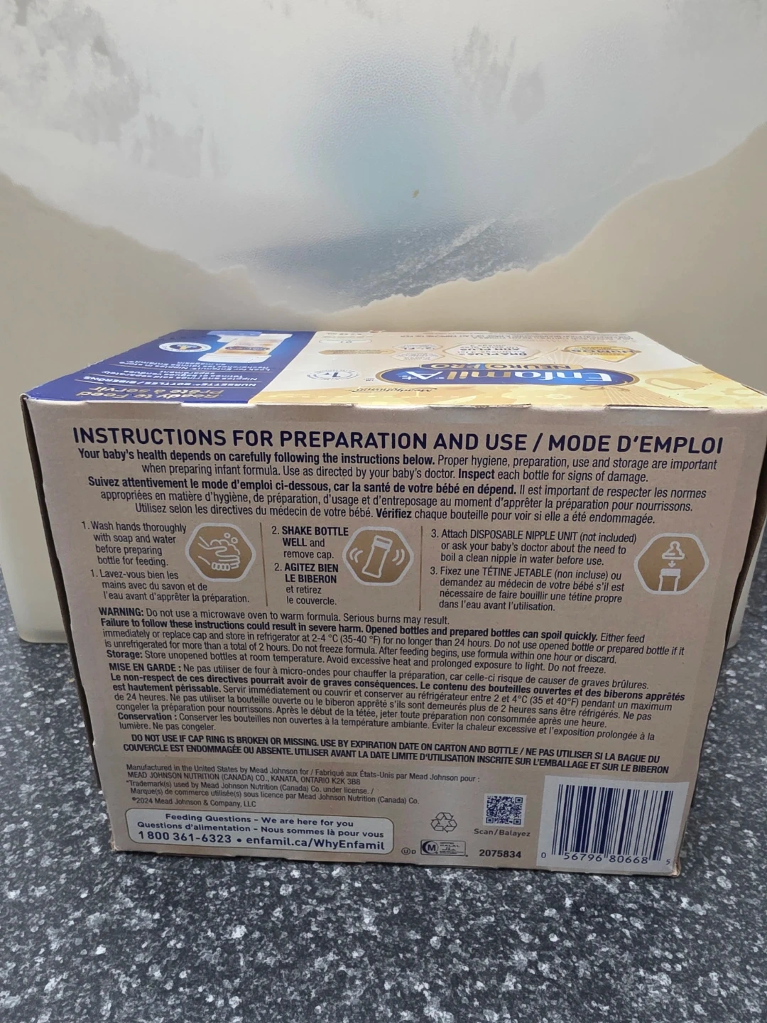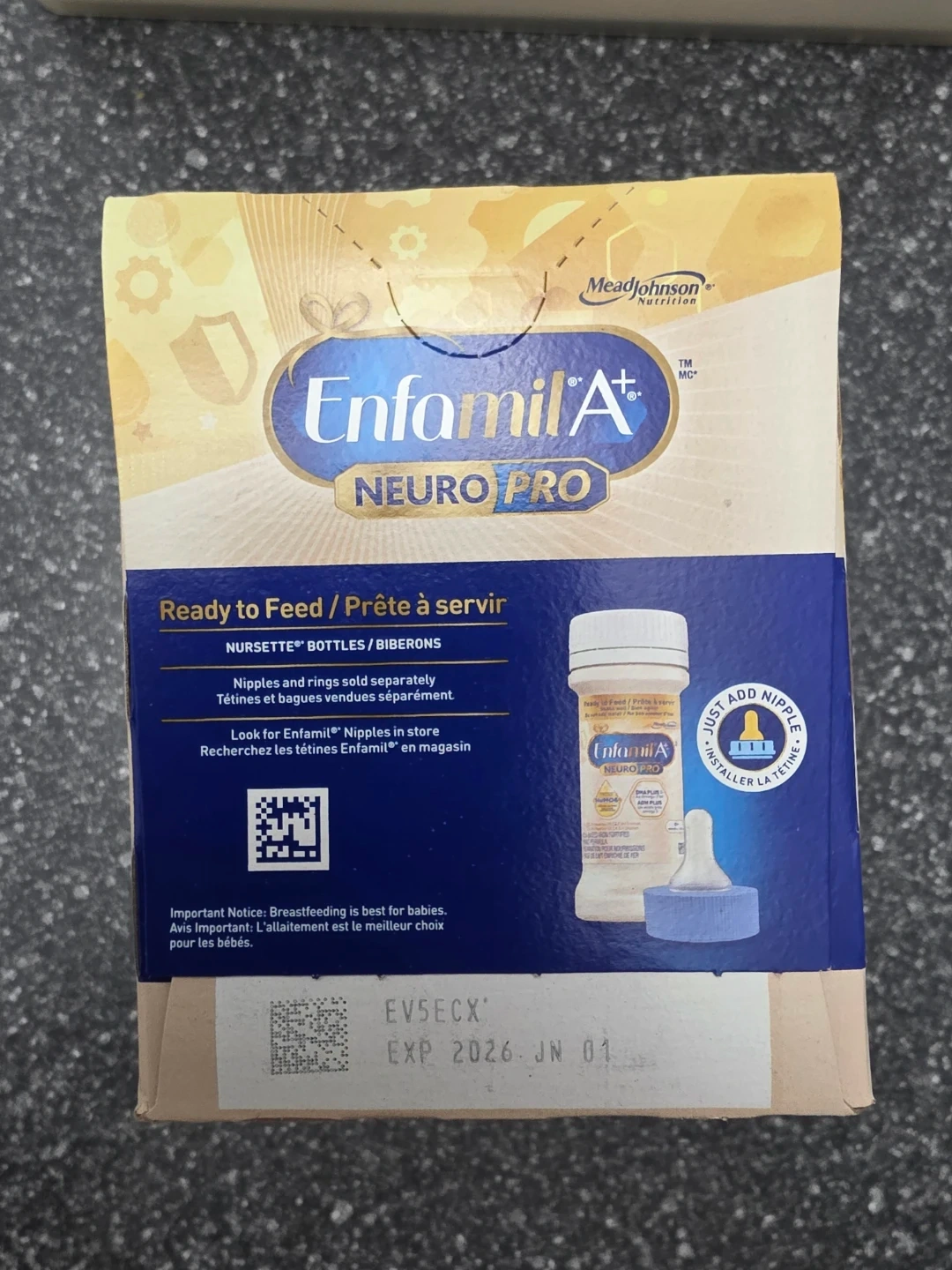 This is Enfamil A+ Neuro Pro ready-to-feed infant formula. Each bottle contains 59 mL. The expiration date is January 2026. Nipple and ring sold separately. New never opened.