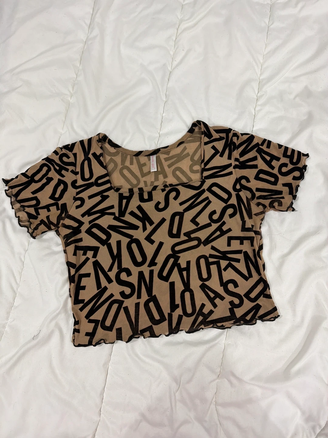 Selling a Girl Crush top with a unique letter print. The top features a square neck and short sleeves with lettuce edge hem. The colour is a tan/brown with black letters. It's in great condition and a fun addition to any wardrobe!