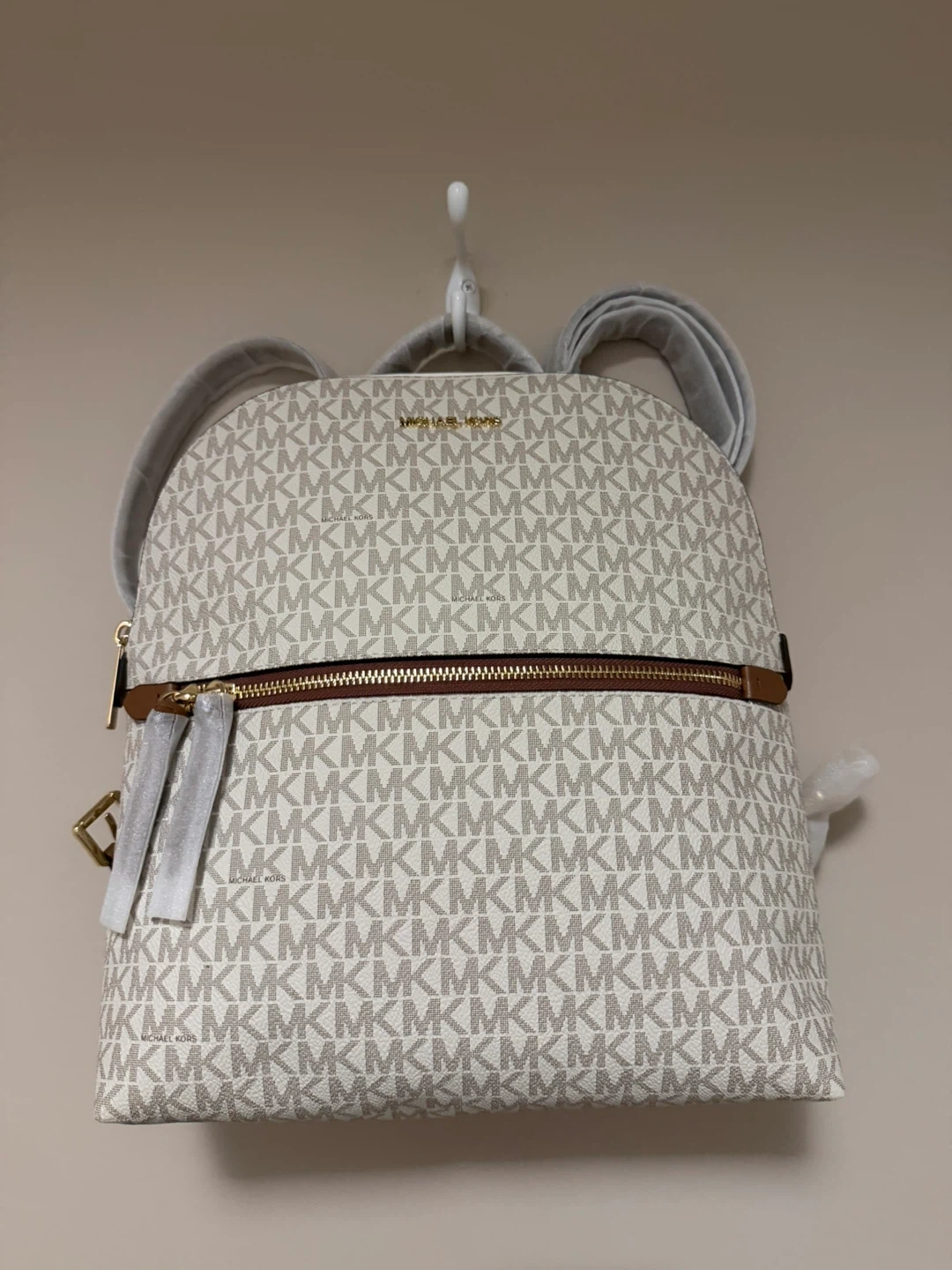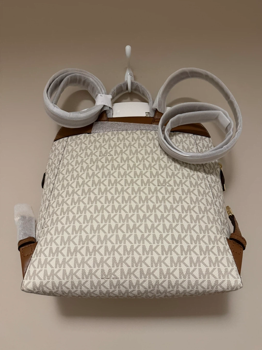 This is a brand new Michael Kors backpack with the signature logo print in Vanilla color. It features brown leather accents and gold-tone hardware. The straps are adjustable.